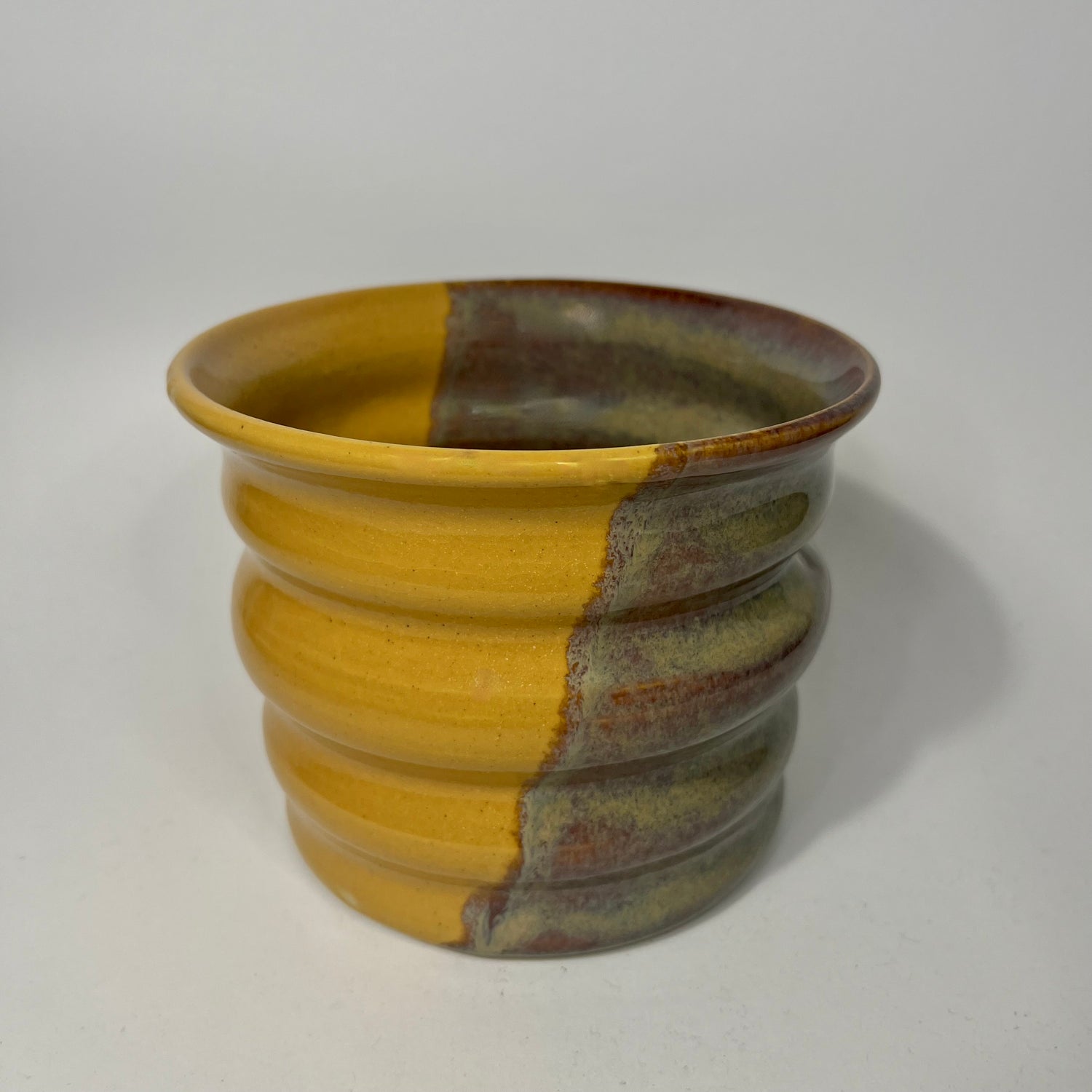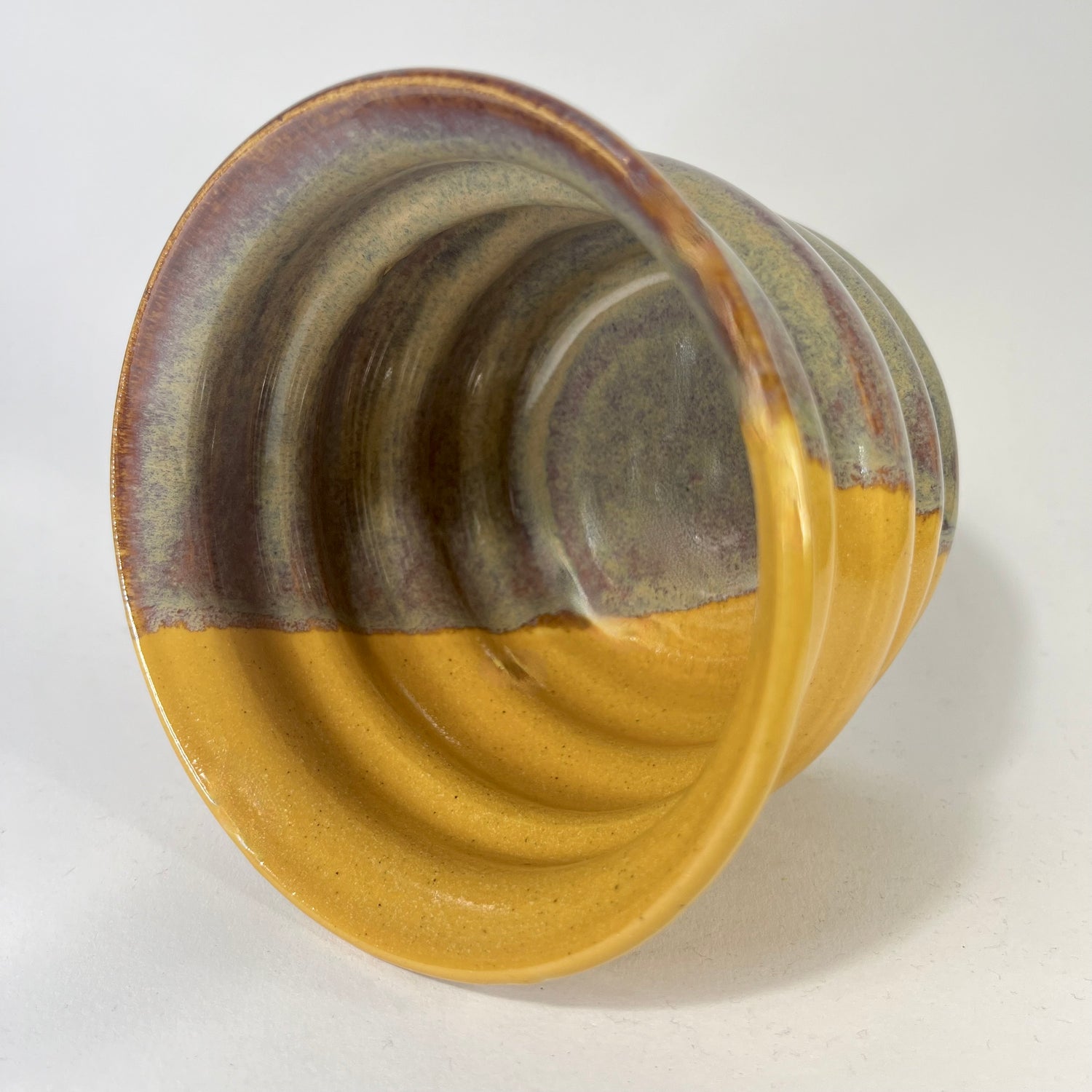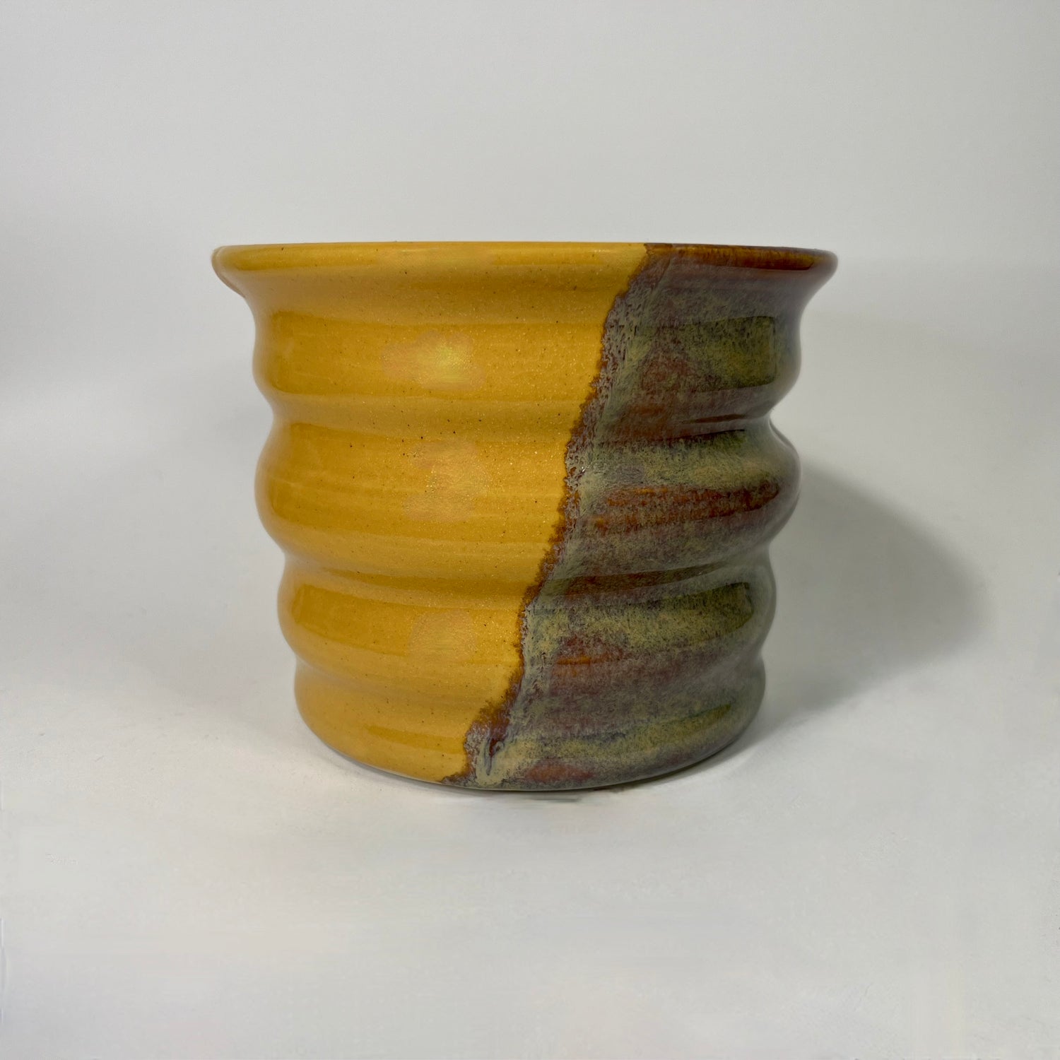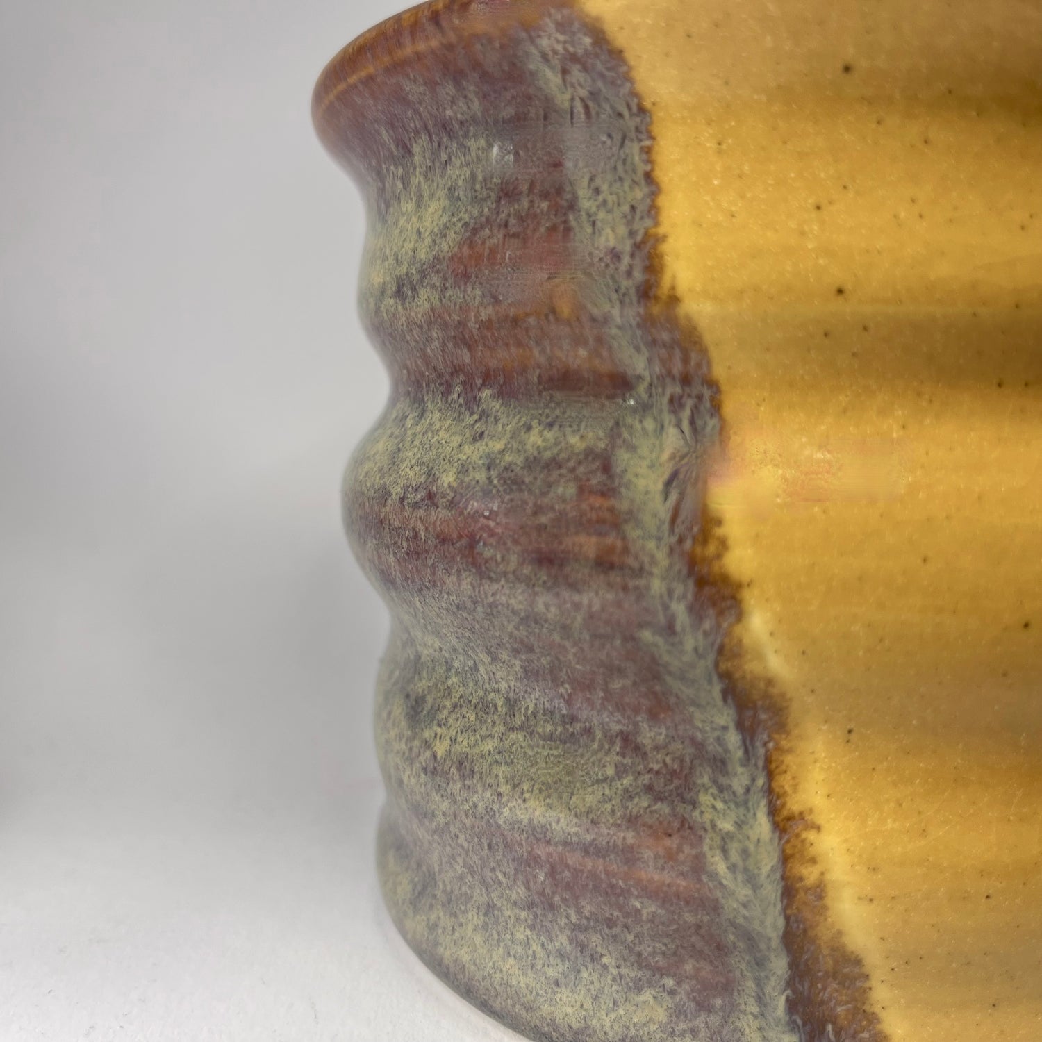 Een klein formaat bloempot met 2 kleuren, zonnebloem geel en, zoals het glazuur heet, een sunset float paars/blauw. Een bloempot met een golfvormige look en speelse vorm. Deze bloempot is geschikt voor een plant met een potmaat P10,5/1L*.