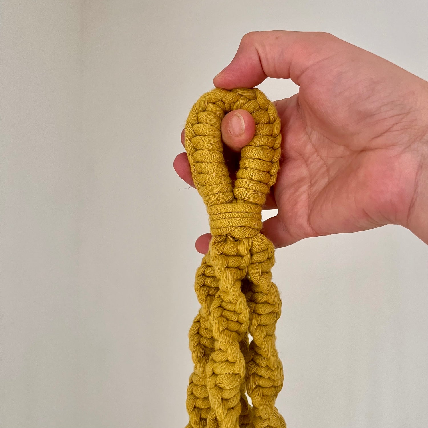 Een hangpot voor een kleine hangplant. Met een geel glazuur en donker blauwe vlekken. Zowel de hangpot als de plantenhanger van touw zijn handgemaakt. De plantenhanger is met diverse macrame technieken gemaakt. Het touw is van hoge kwaliteit katoen, chartreuse kleur, single twist en 5 mm dikte. Deze hangpot is geschikt voor een plant met een potmaat P13/1,2L*.