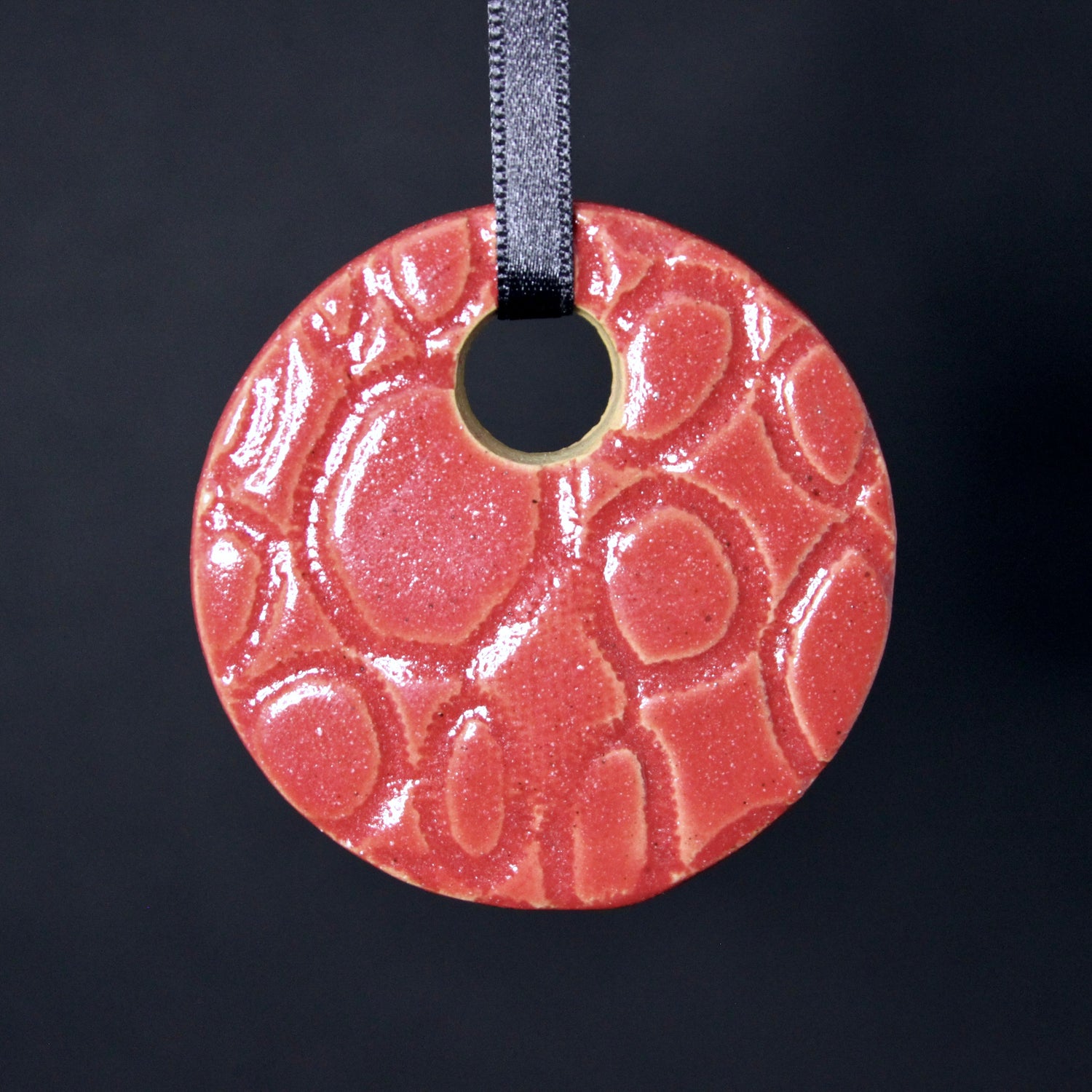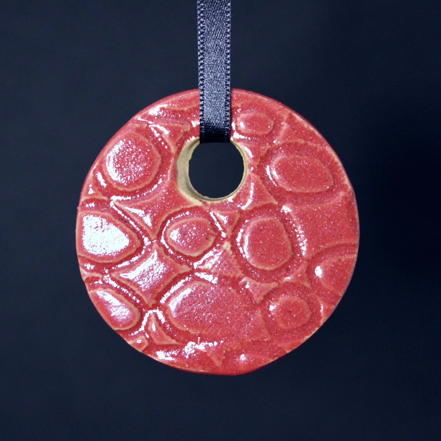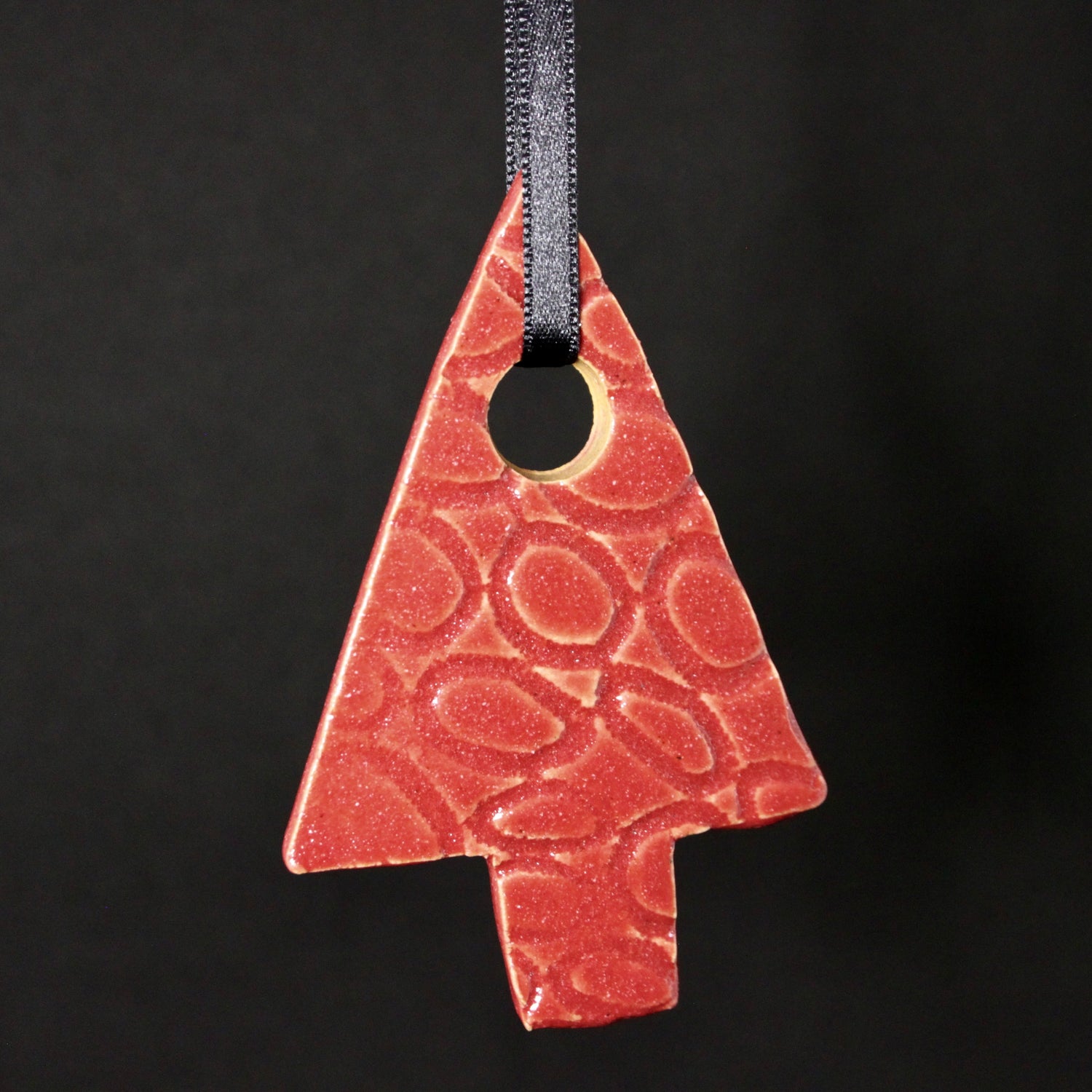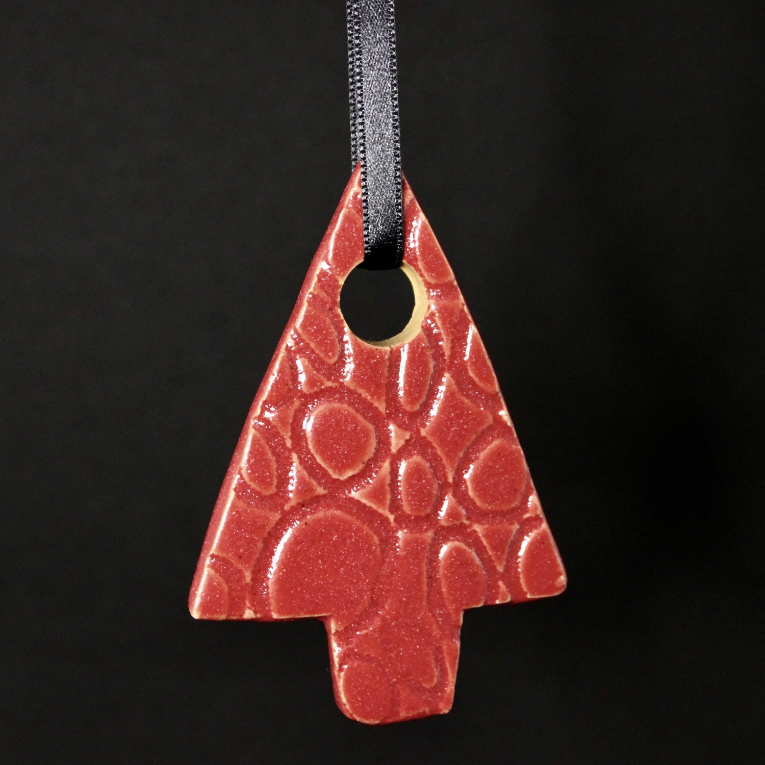 Een unieke handgemaakte kersthanger in de kleur rood. Je kunt kiezen uit een kerstboom of een kerstbal met een cirkelvormig patroon.