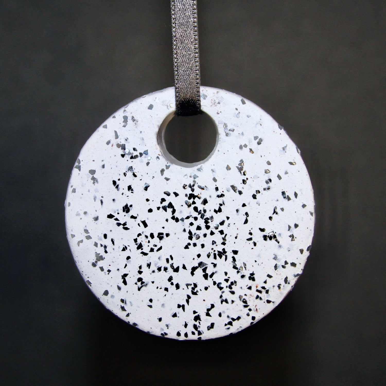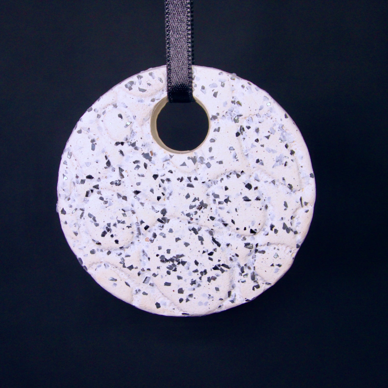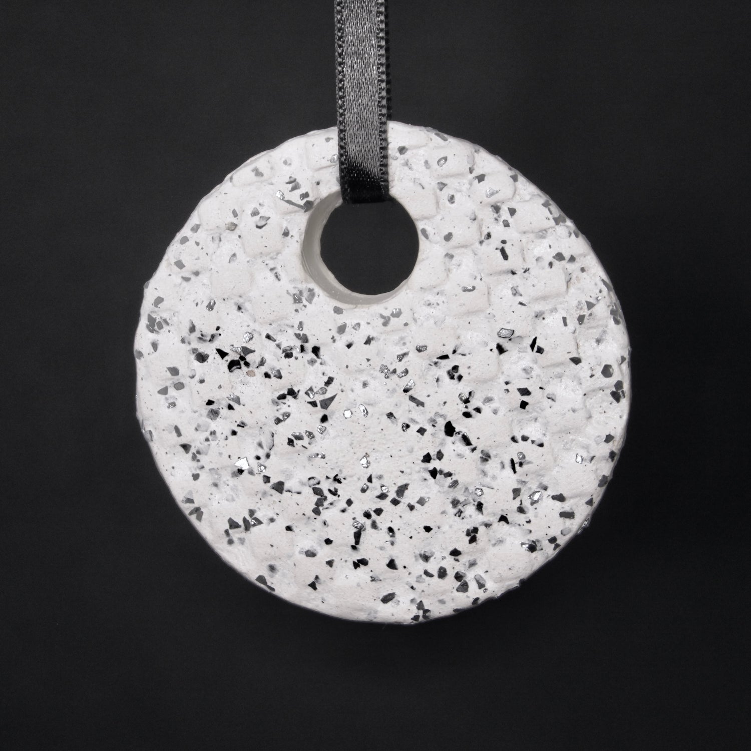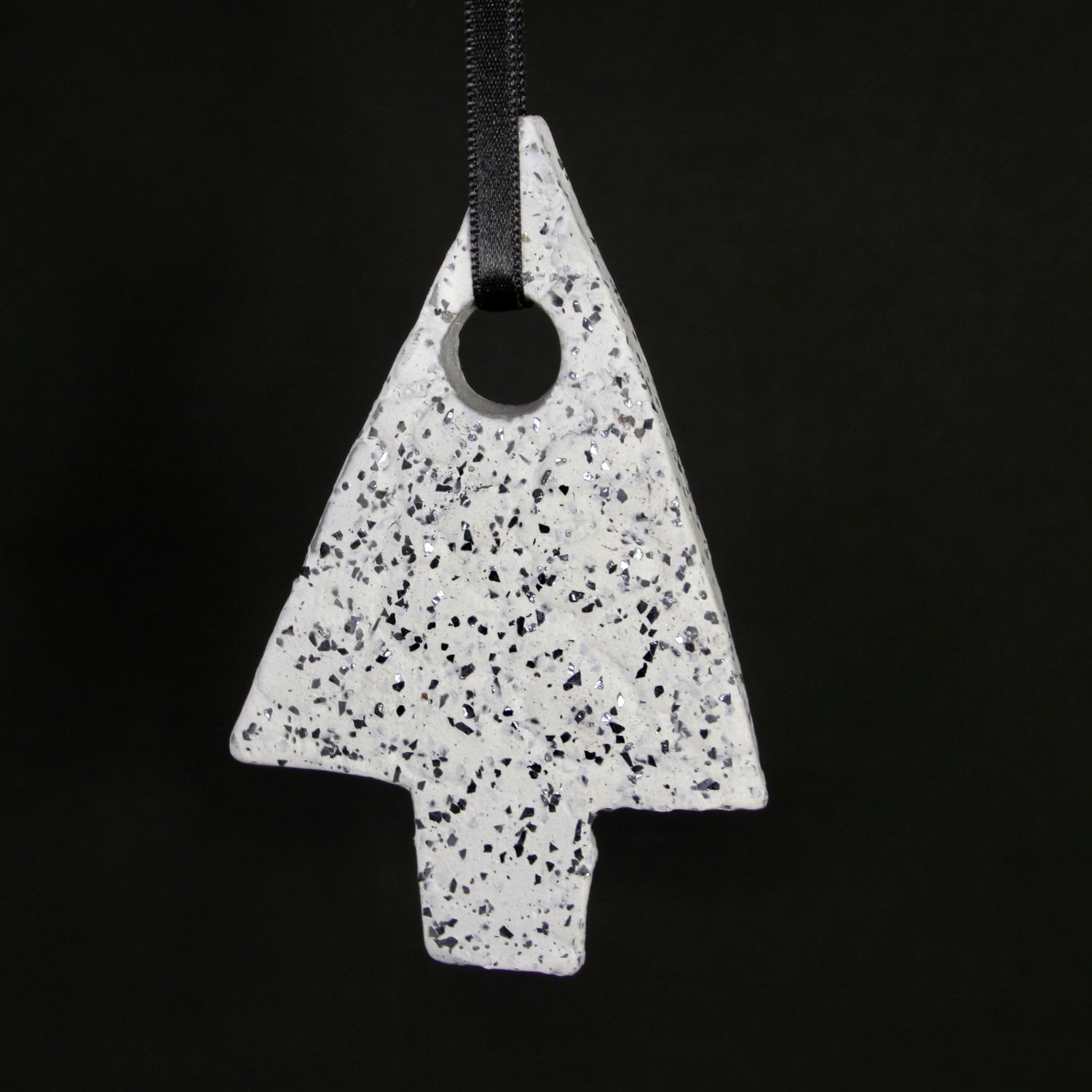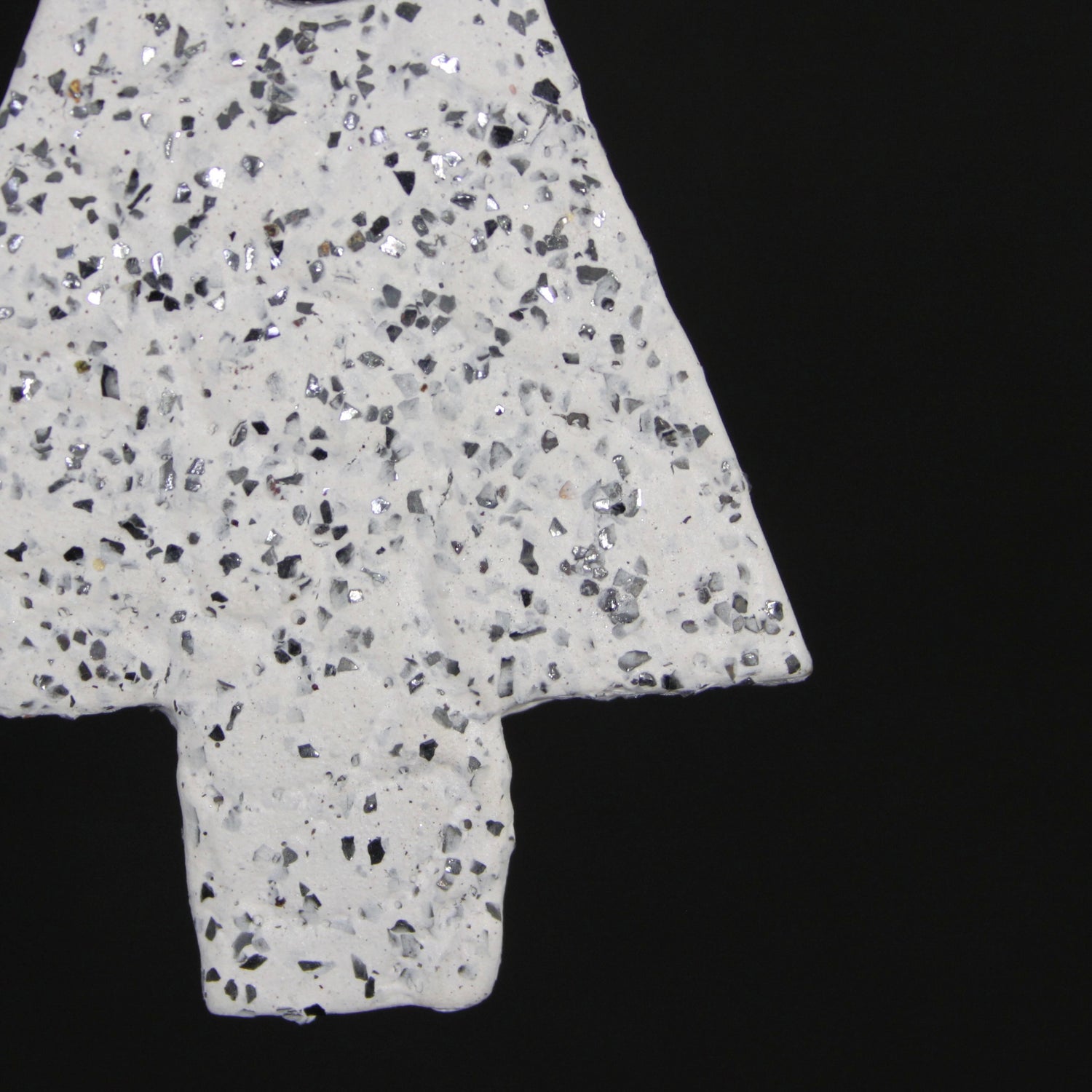 Een unieke handgemaakte kersthanger in de kleur mat wit met glitters. Je kunt kiezen uit een kerstboom of een kerstbal met een cirkelvormig patroon, een vierkant patroon of een geen patroon.