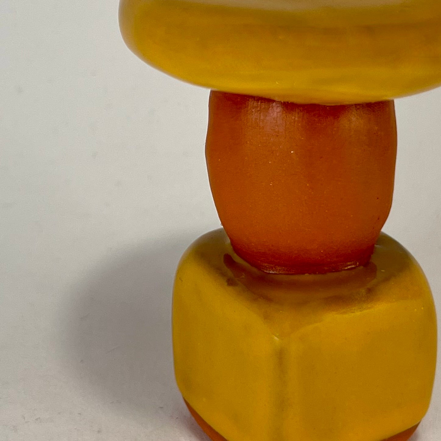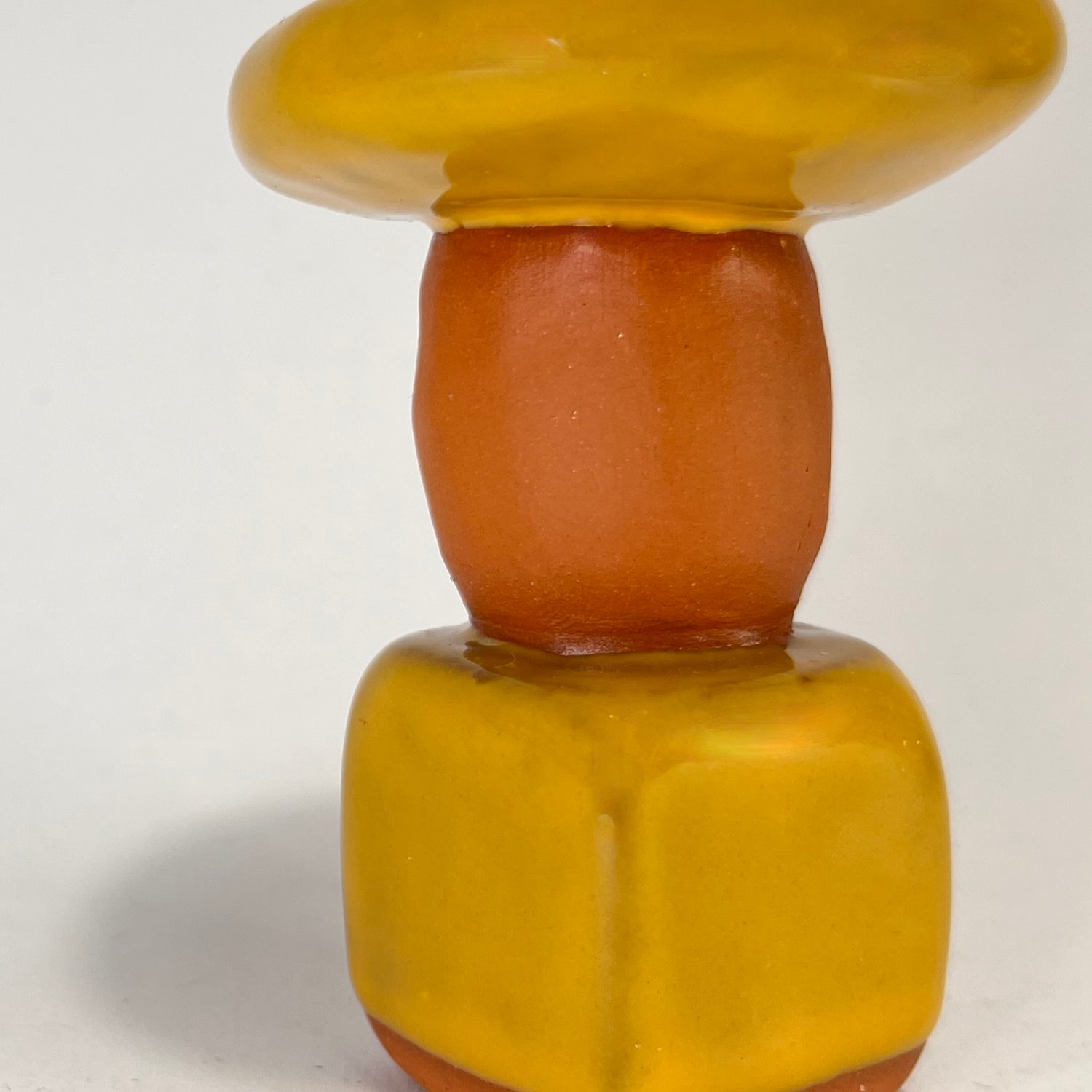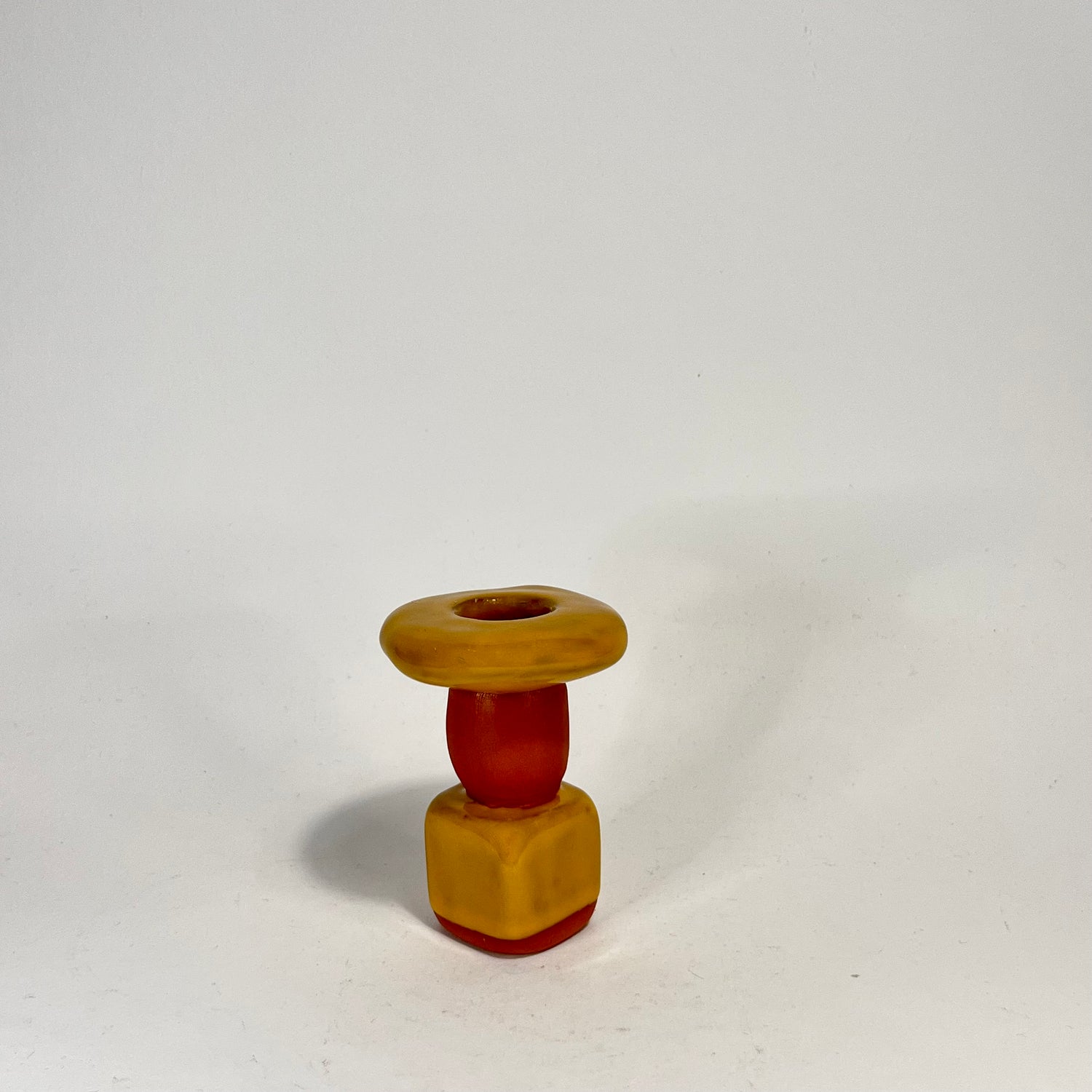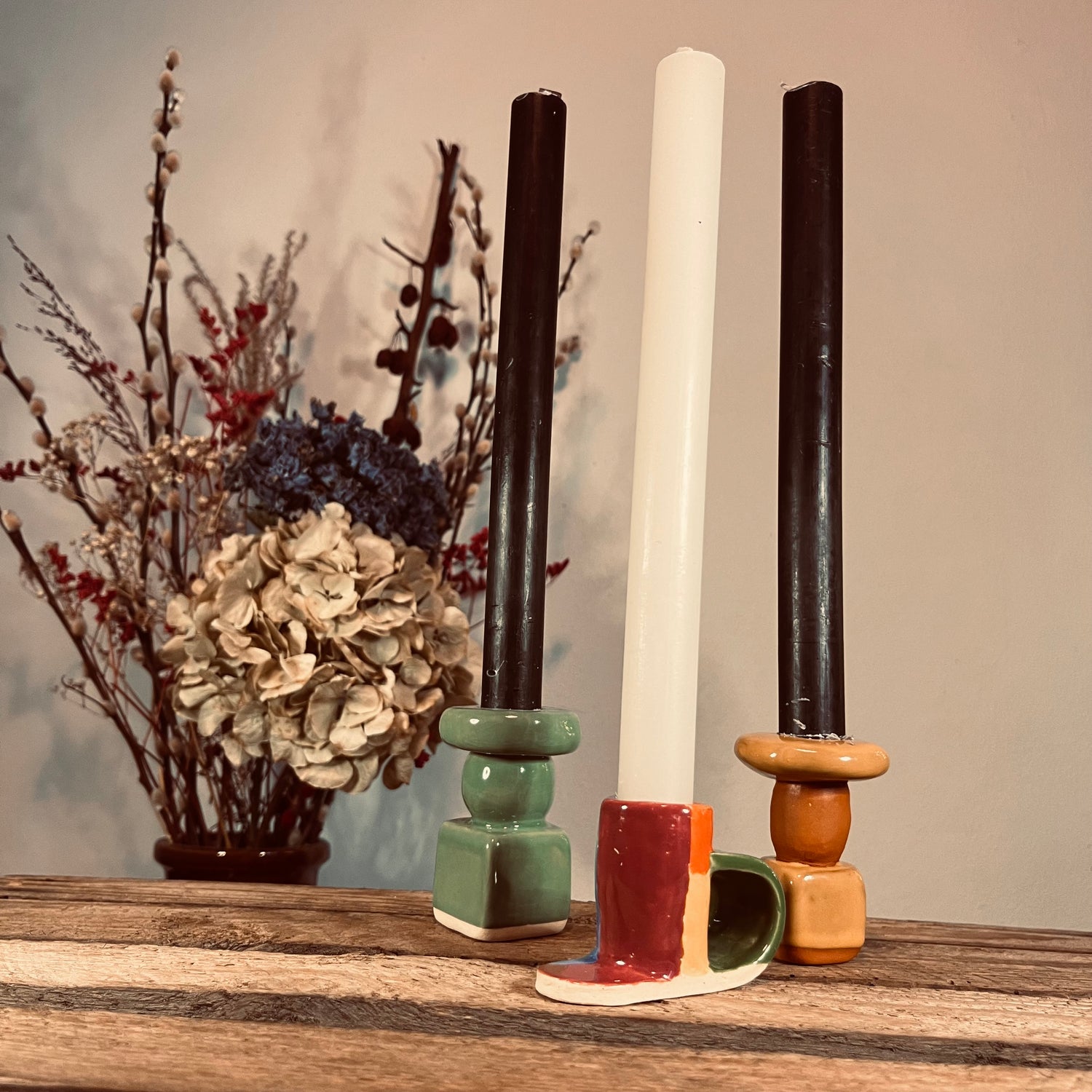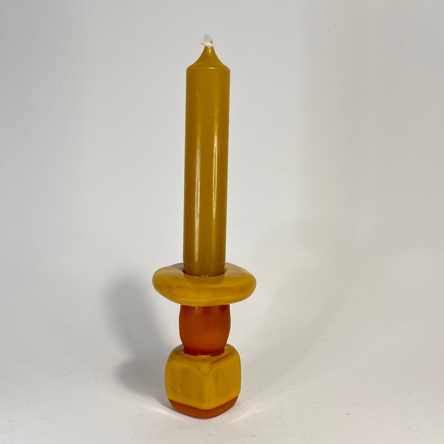 Deze kleine kandelaar van keramiek is handgemaakt. Met zijn speelse vormen en een vrolijke zomerse kleuren is deze kleine kandelaar de perfecte toevoeging voor thuis. Hij is gemaakt met roodbakkende klei, ook wel terracotta genoemd, in combinatie met een mosterd geel glazuur. De kandelaar is gemaakt voor kaarsen met een diameter van 2,5 cm.