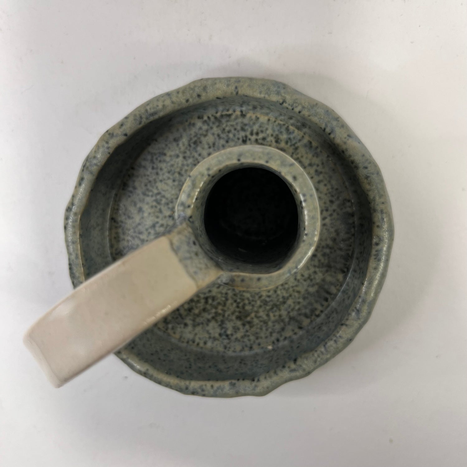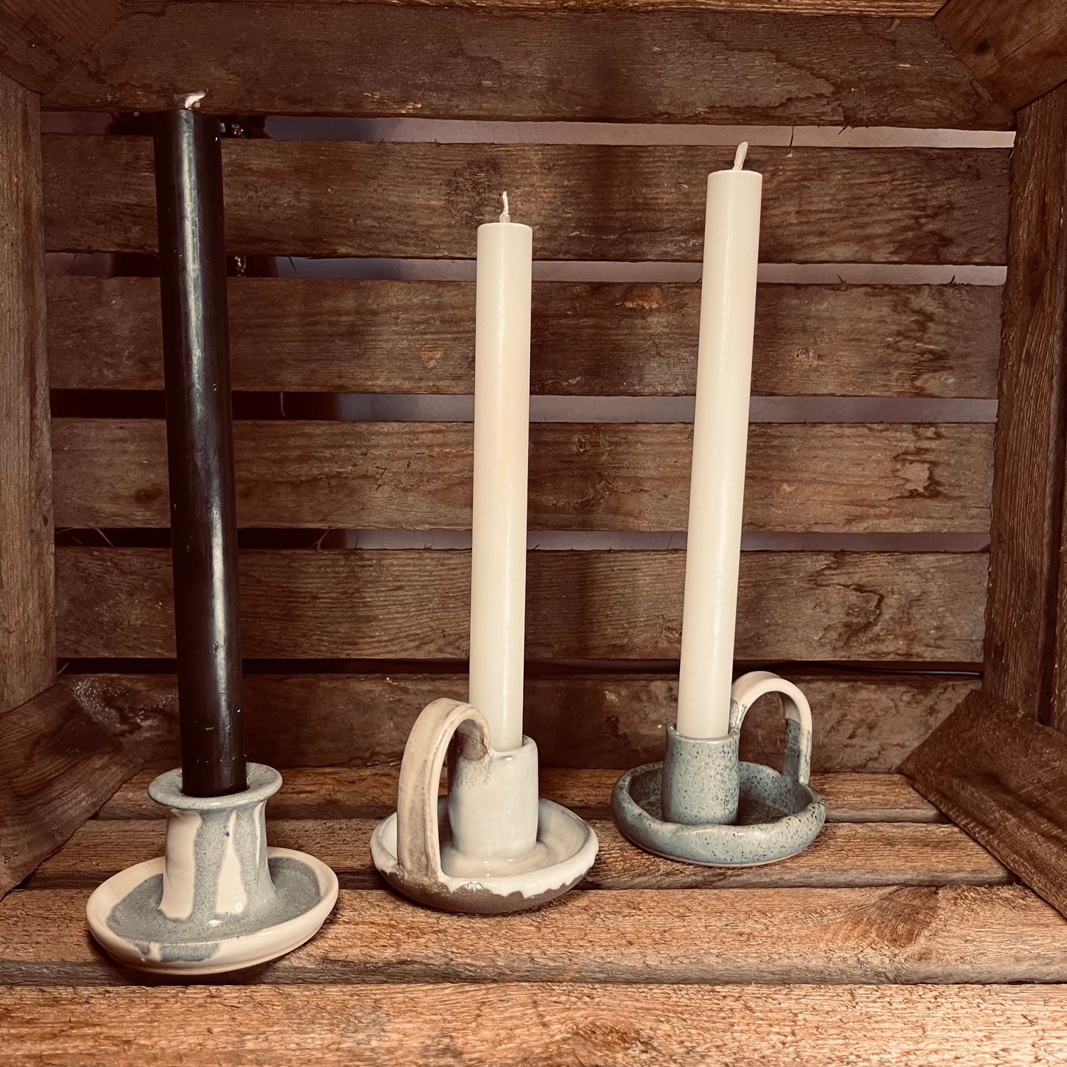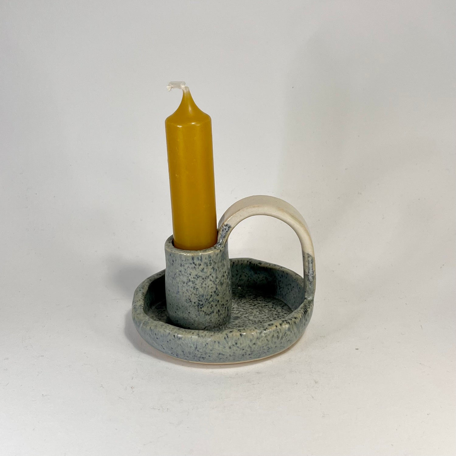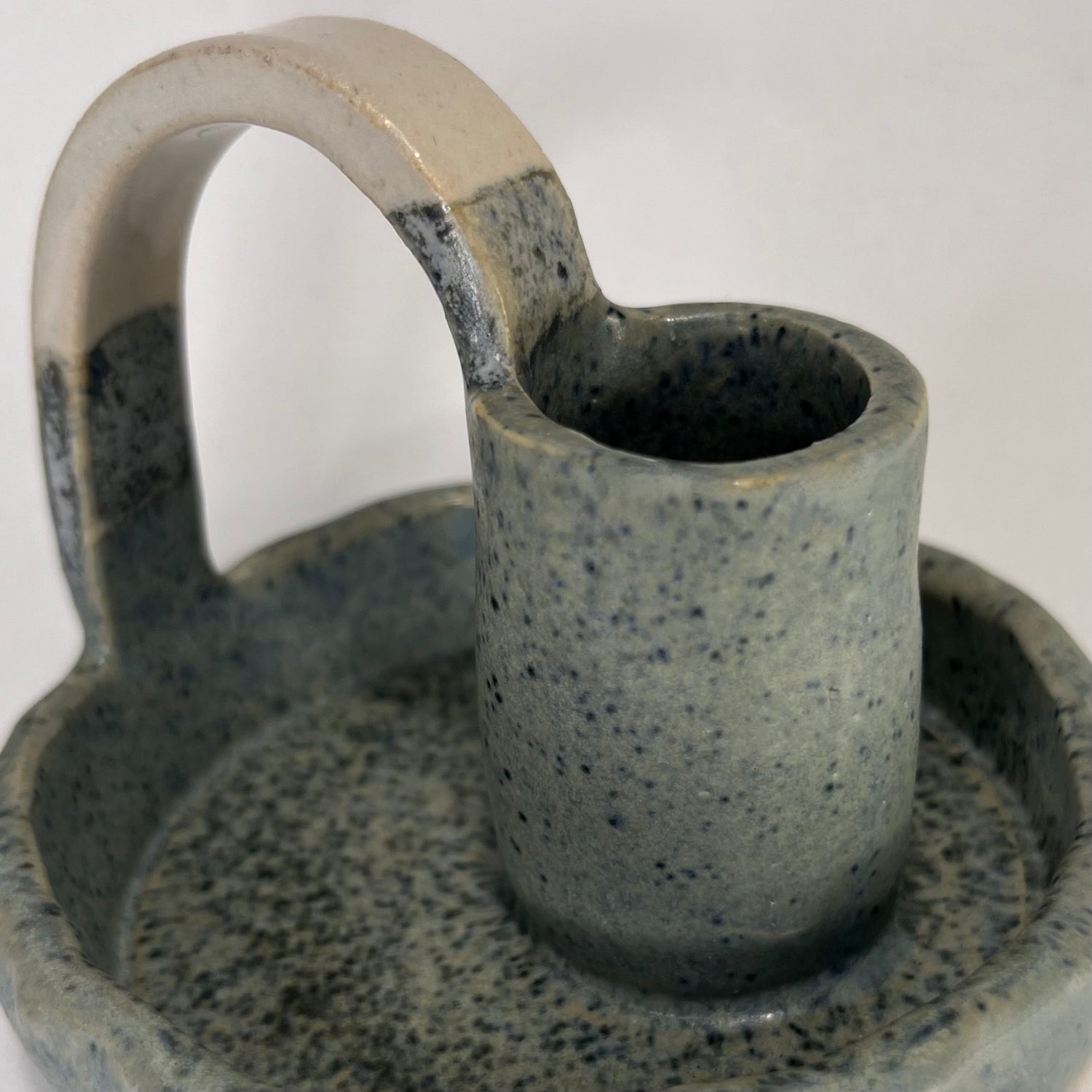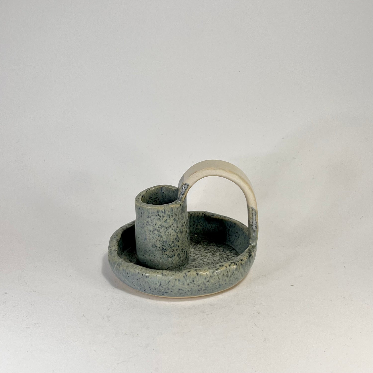 Deze kleine kandelaar van keramiek is handgemaakt. Een simpele vorm en met een lichtblauw mat en wit glazuur. De kleine kandelaar heeft een handvat waarmee je hem handzaam kan verplaatsen. De kandelaar is gemaakt voor kaarsen met een diameter van 2,5 cm.