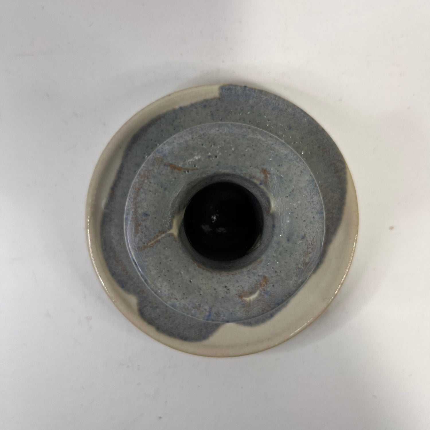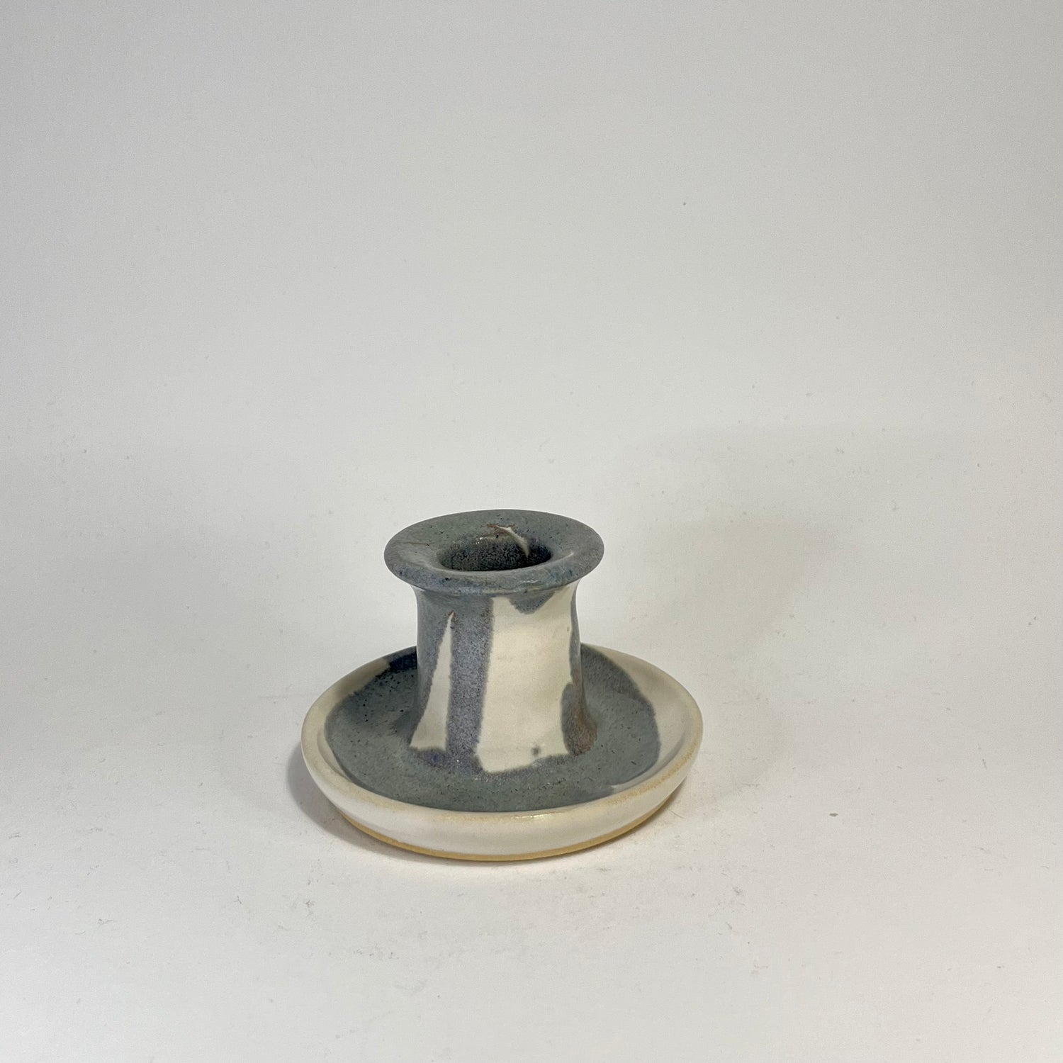 Deze kleine kandelaar van keramiek is handgemaakt. Een simpele vorm en wit met blauw geglazuurd. De kandelaar is gemaakt voor kaarsen met een diameter van 2,5 cm.