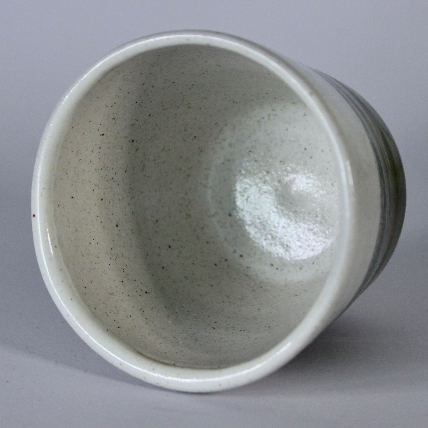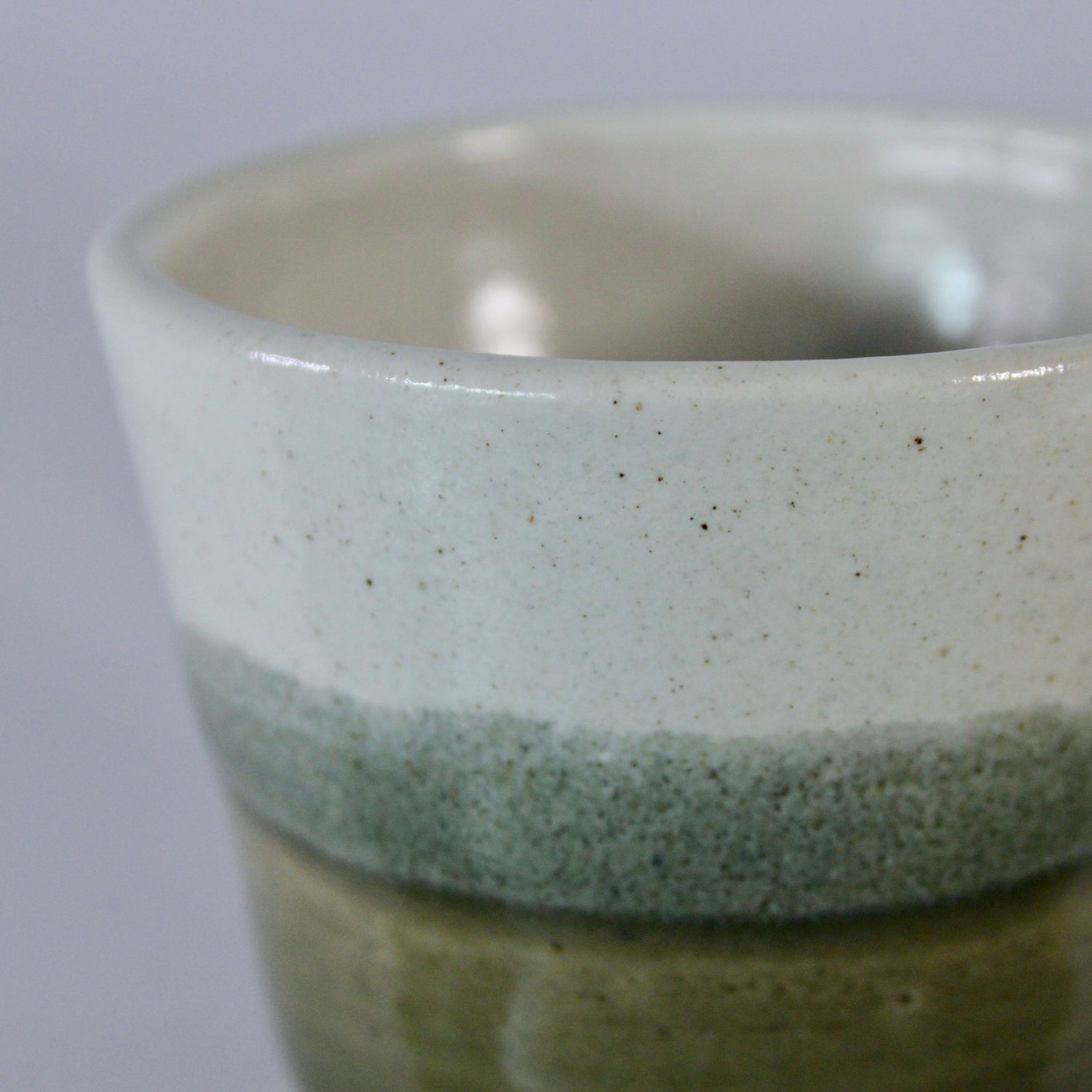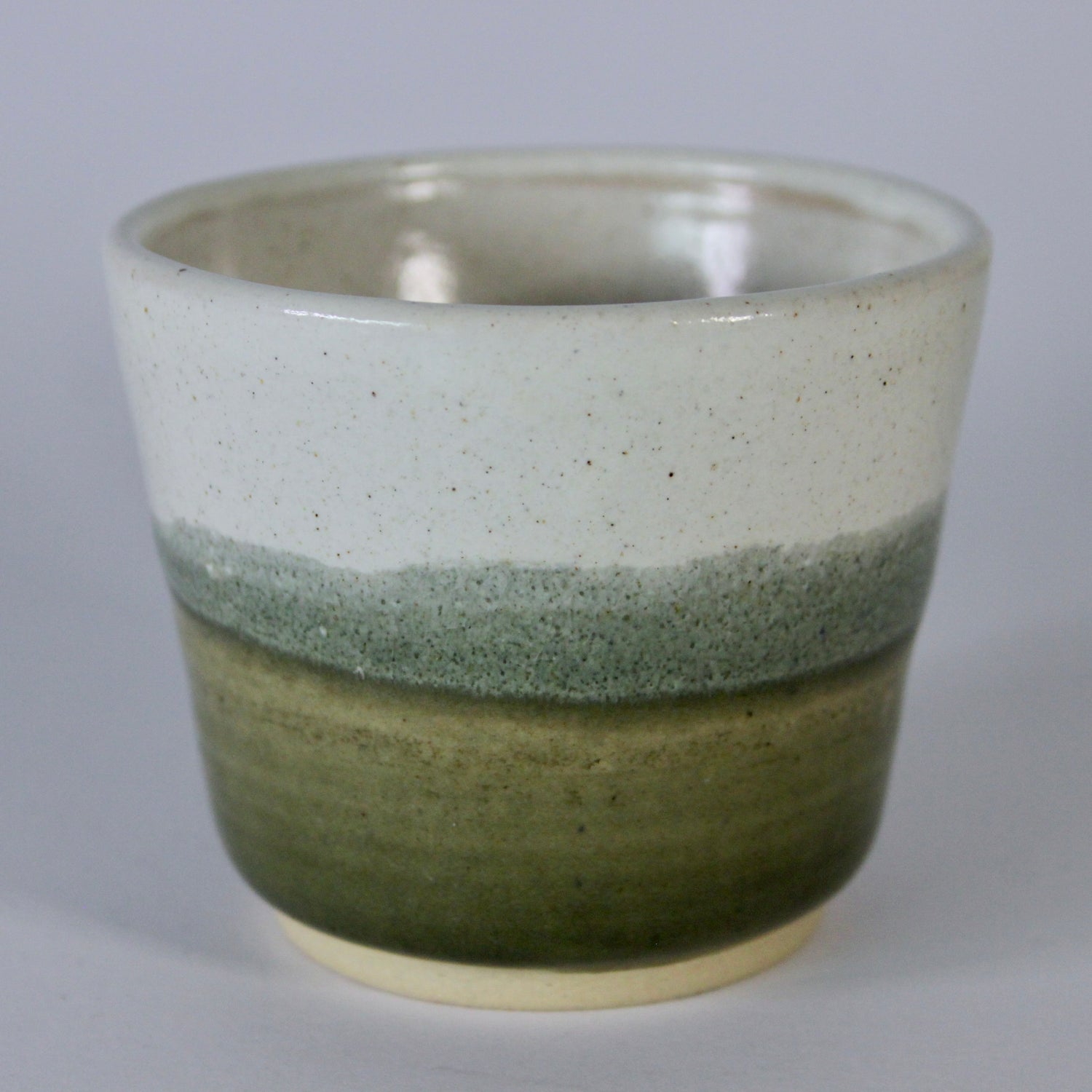 Een koffiekopje van keramiek in aardse tinten, wit met een natuurlijke groen. Handgemaakt en met glazuur die gemaakt is op basis van eigen gewonnen klei uit Spaarnwoude.