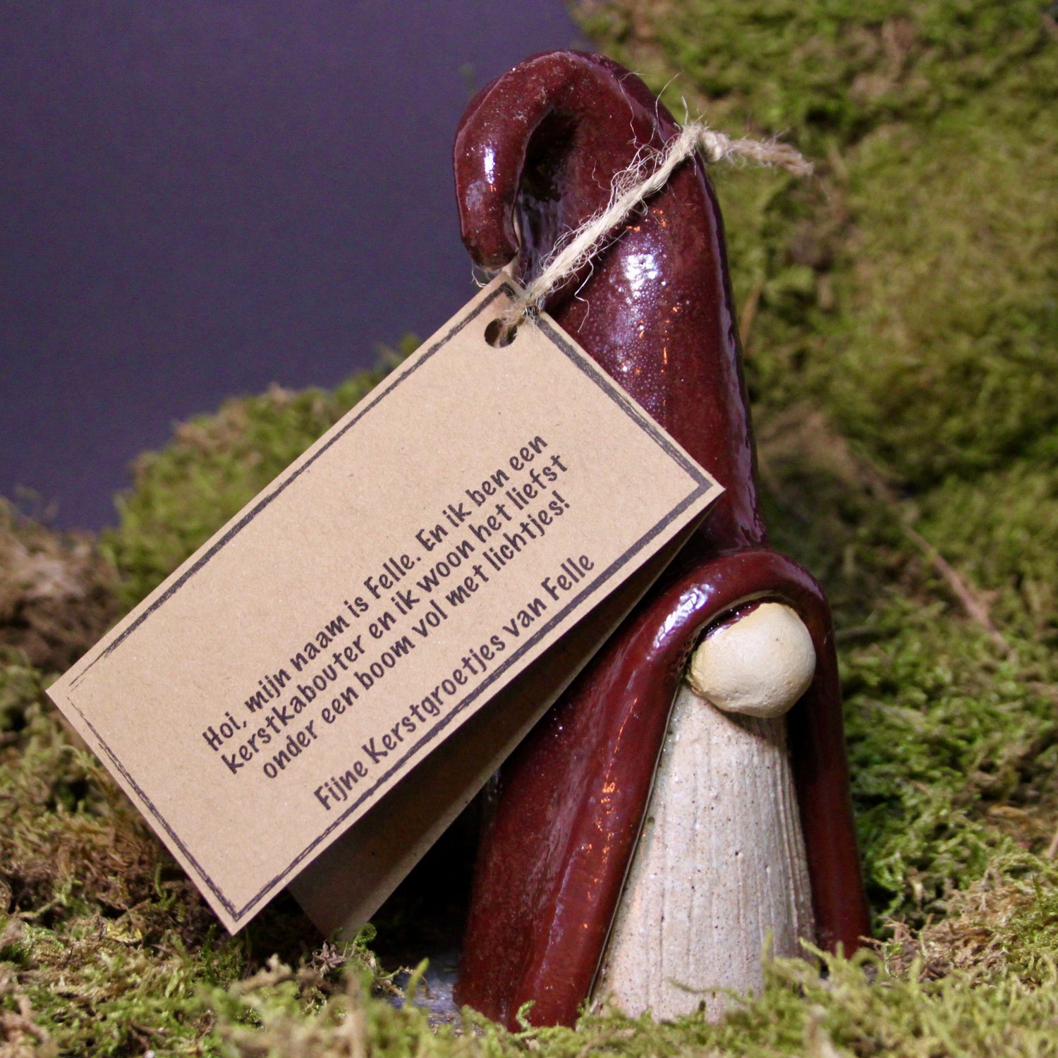 Felle is een handgemaakte keramische kerstkabouter en daarom uniek. Deze kerstkabouter is met de hand geglazuurd met een glazuur die gemaakt is op basis van klei dat uit de grond is gehaald in Spaarnwoude. Felle de kerstkabouter heeft een rode muts en een witte baard.