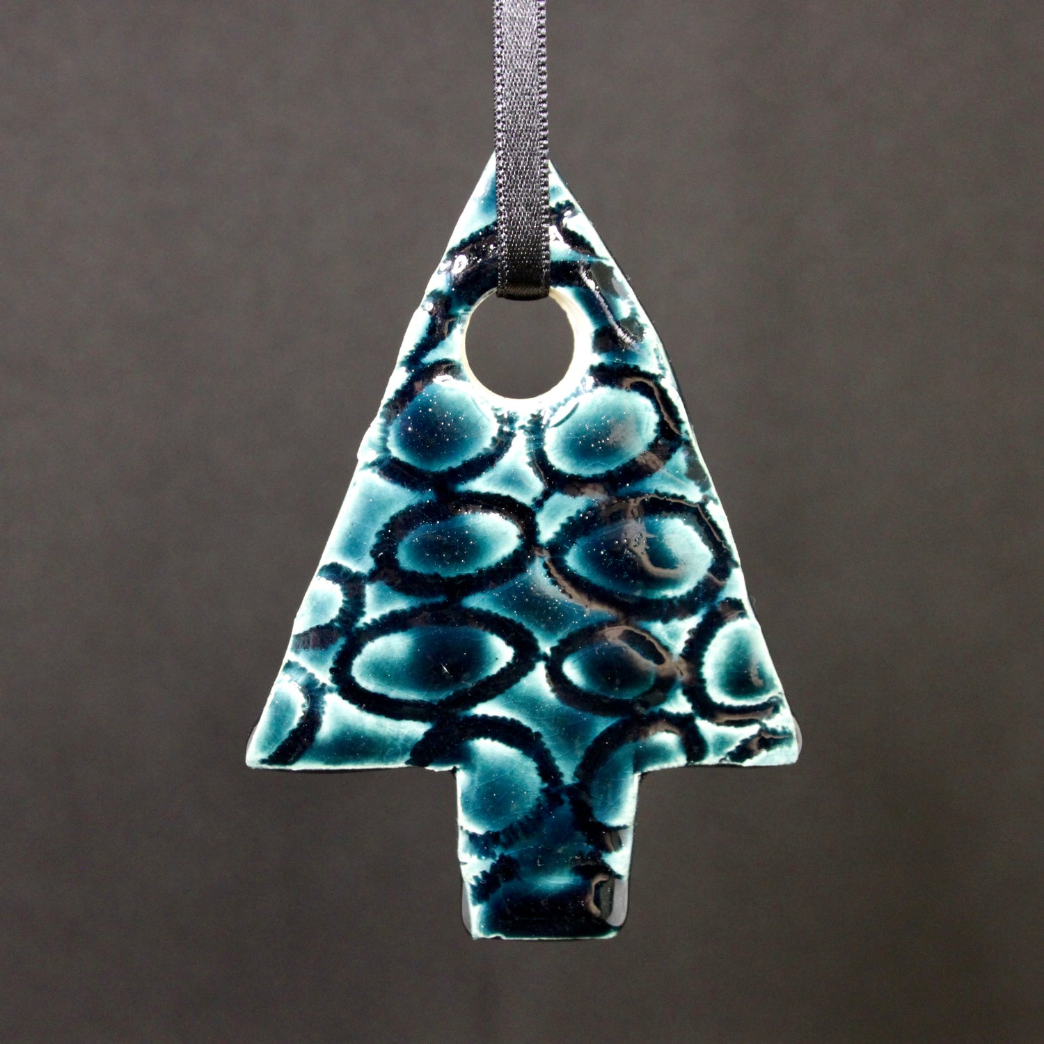 Een unieke handgemaakte kersthanger in de kleur turquoise blauw. Je kunt kiezen uit een kerstboom of een kerstbal met een cirkelvormig patroon of een divers patroon.