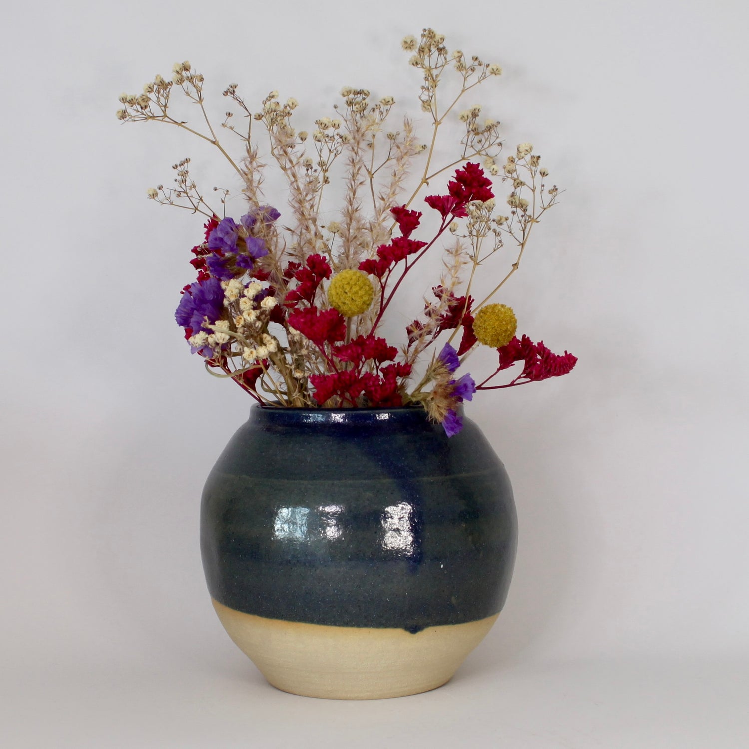 Een bolle vaas met blauw glazuur. Dit vaasje is geglazuurd op basis van klei dat zelf uit de grond is geboord in Spaarnwoude. Geschikt voor kleine bloemetjes.