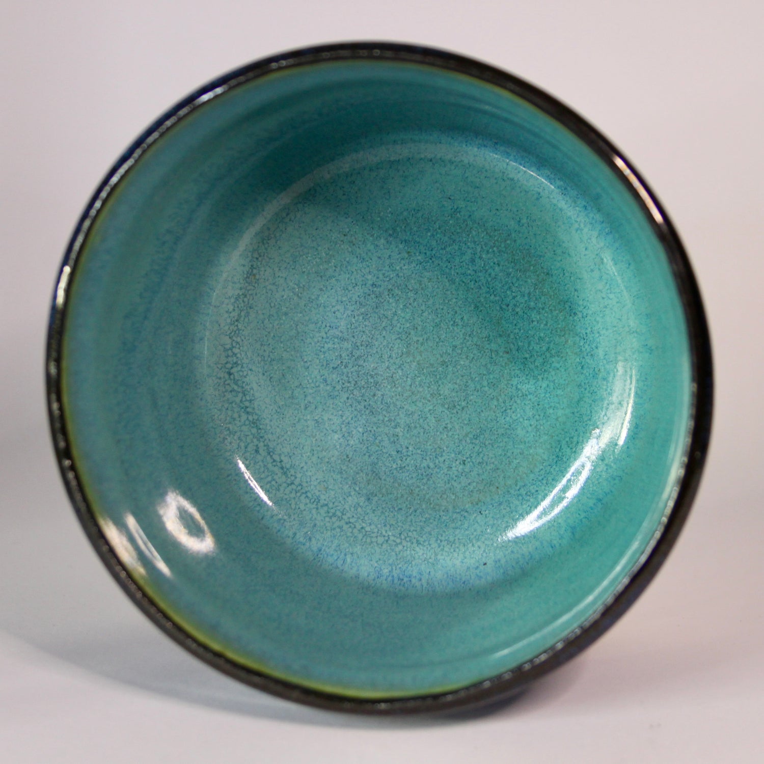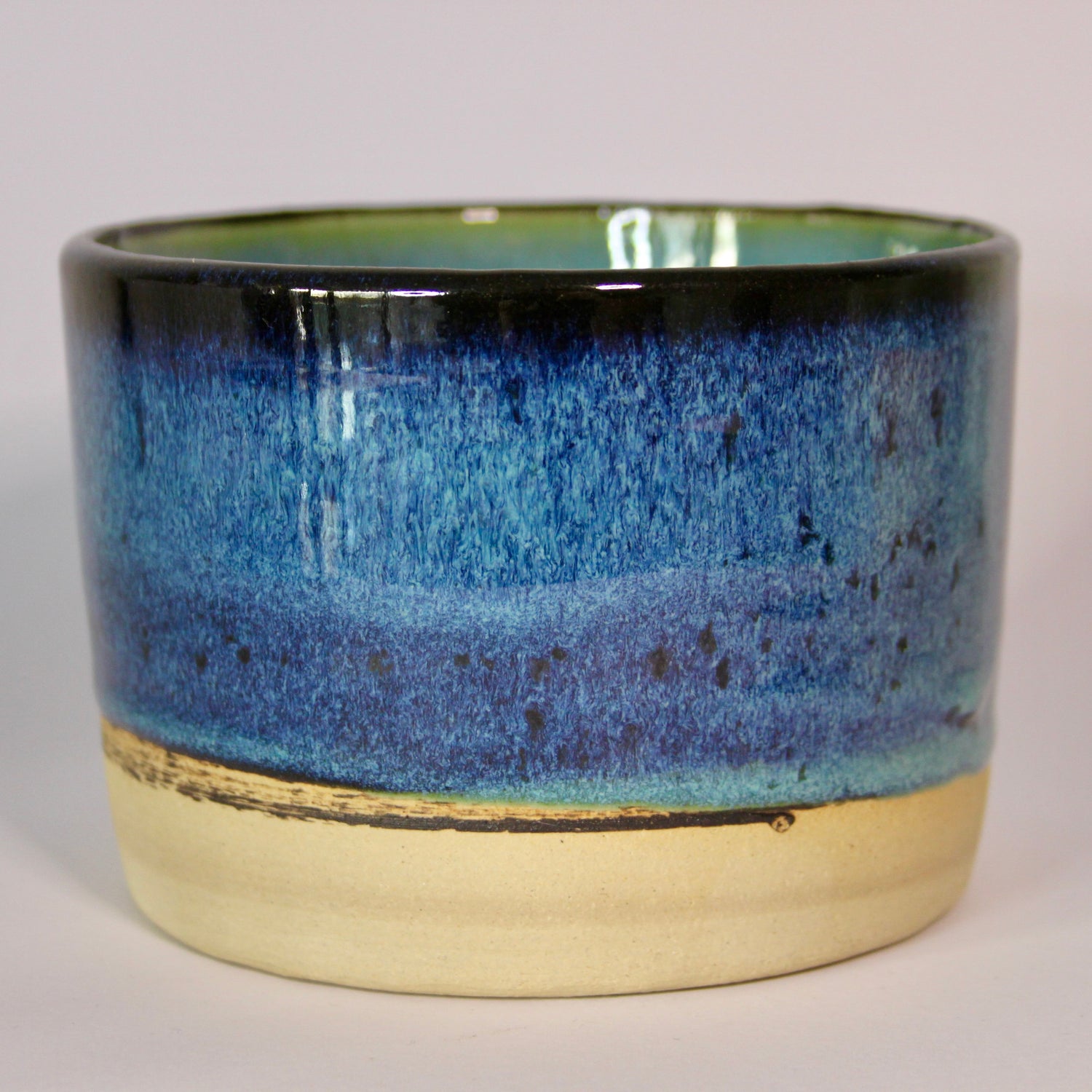 Een klein formaat bloempot met donker blauw glazuur waar zwart in vermengt zit. Deze bloempot is geschikt voor een kleine plant.