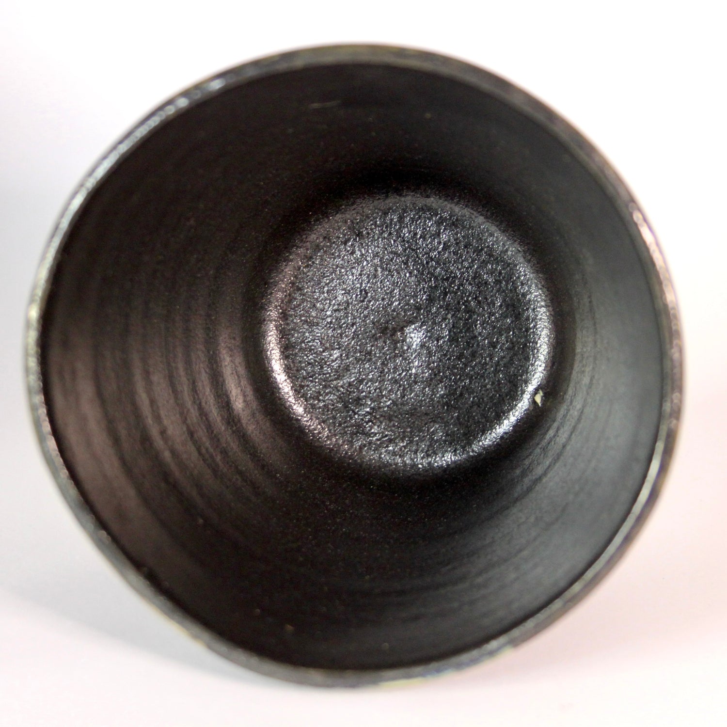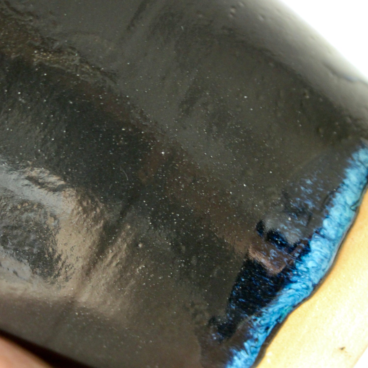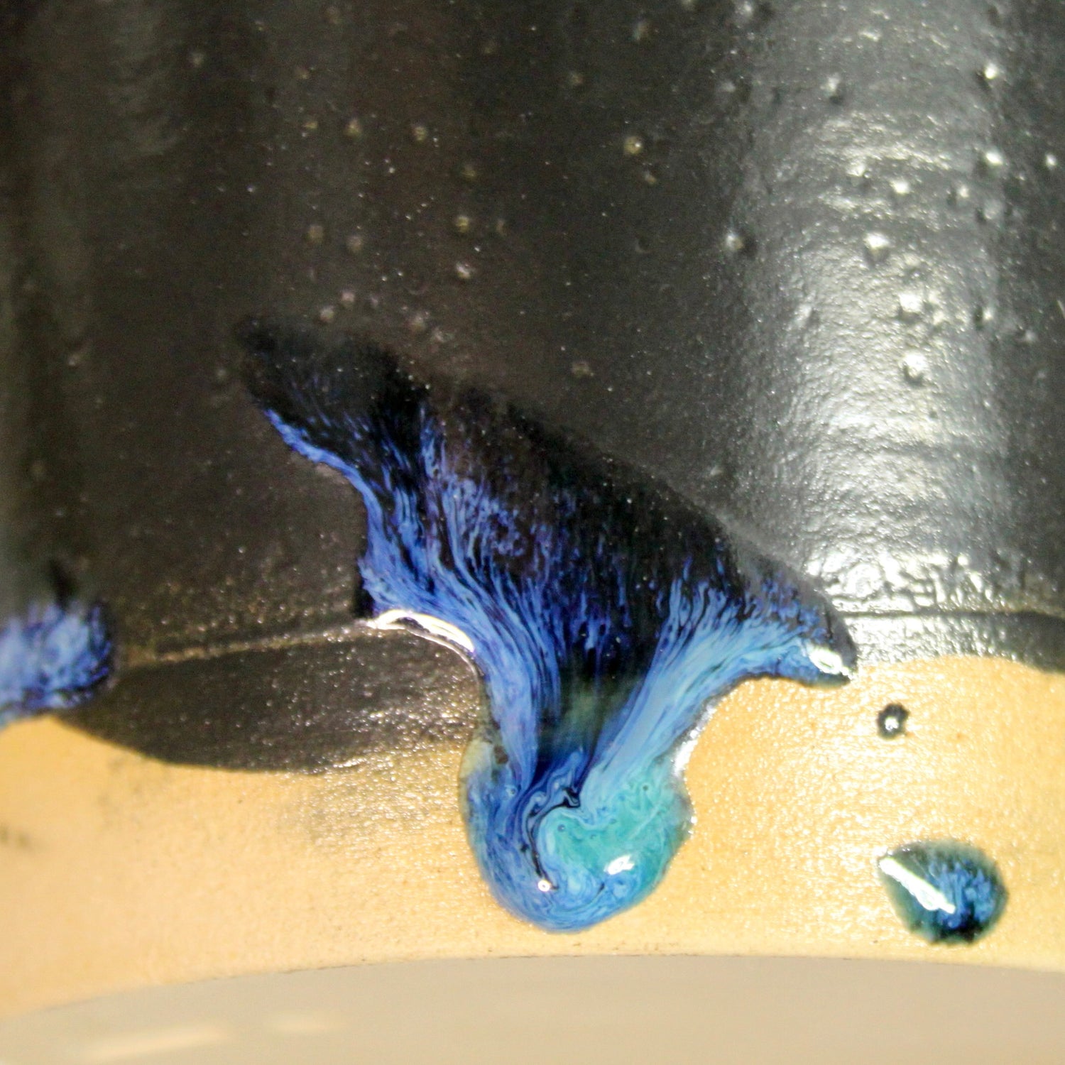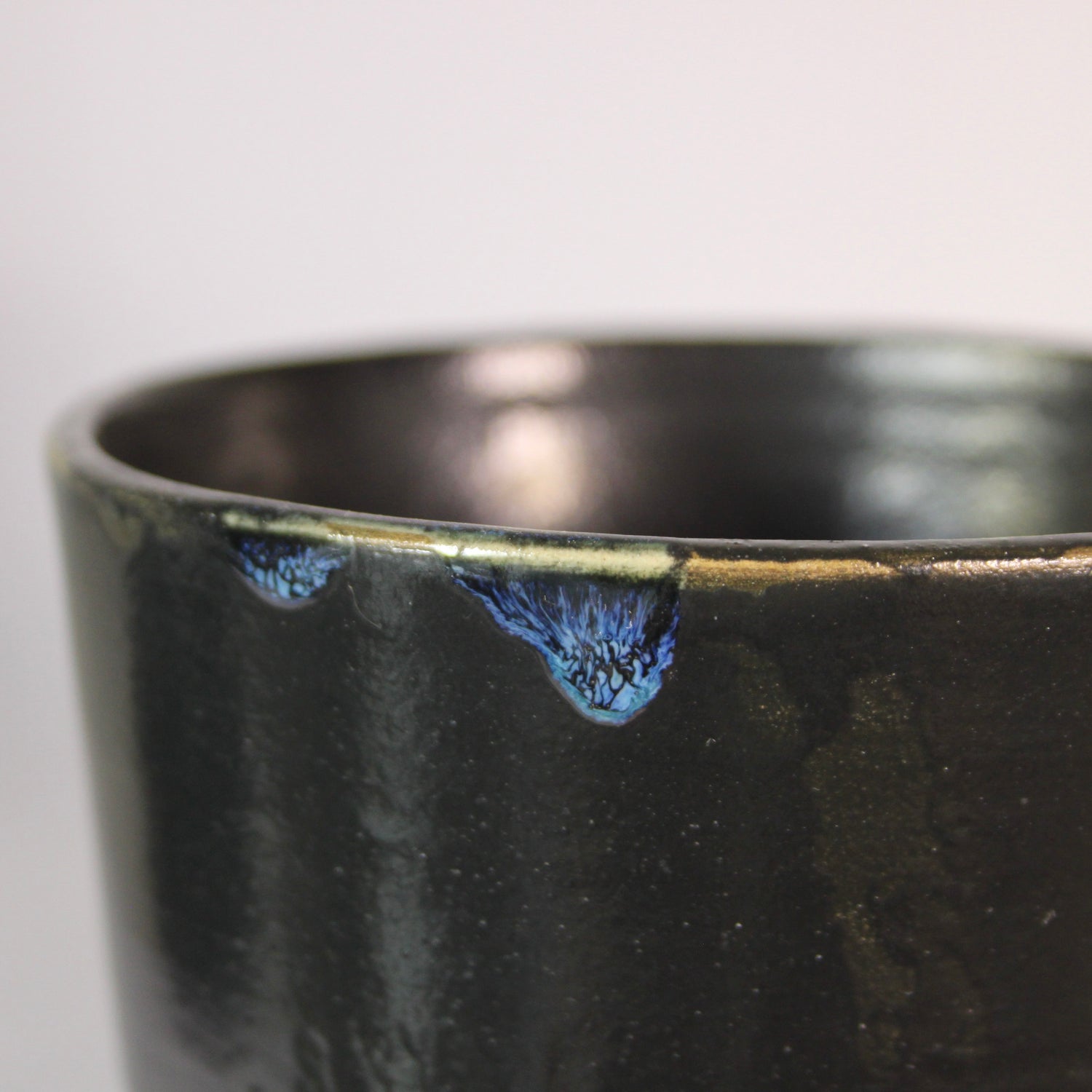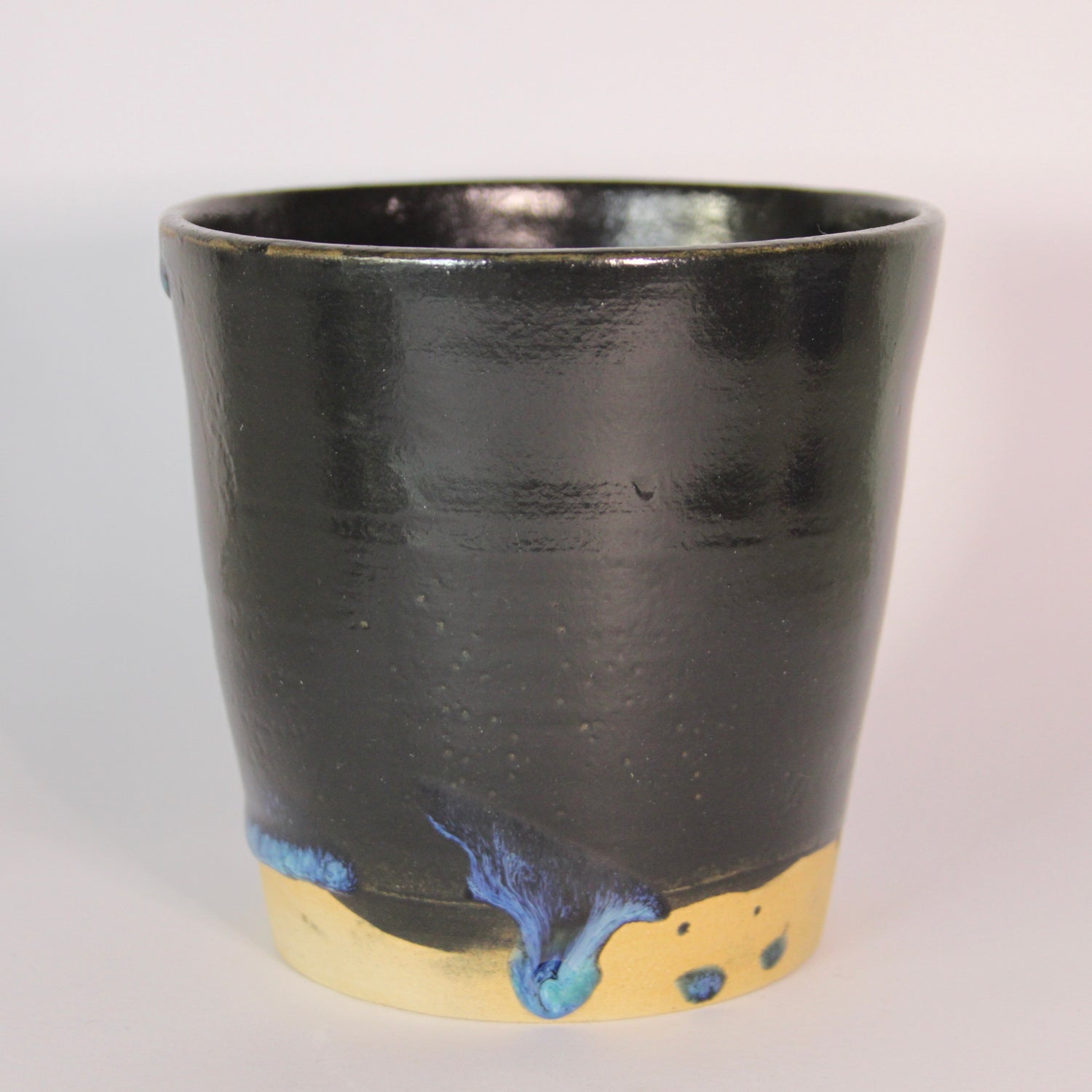 Een klein formaat bloempot met een zwart mat glazuur met blauwe druipers. Deze bloempot is geschikt voor een kleine plant.