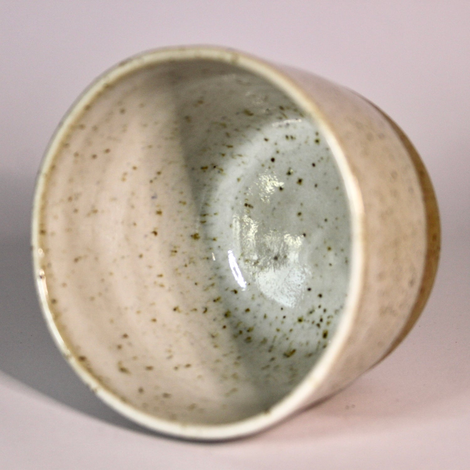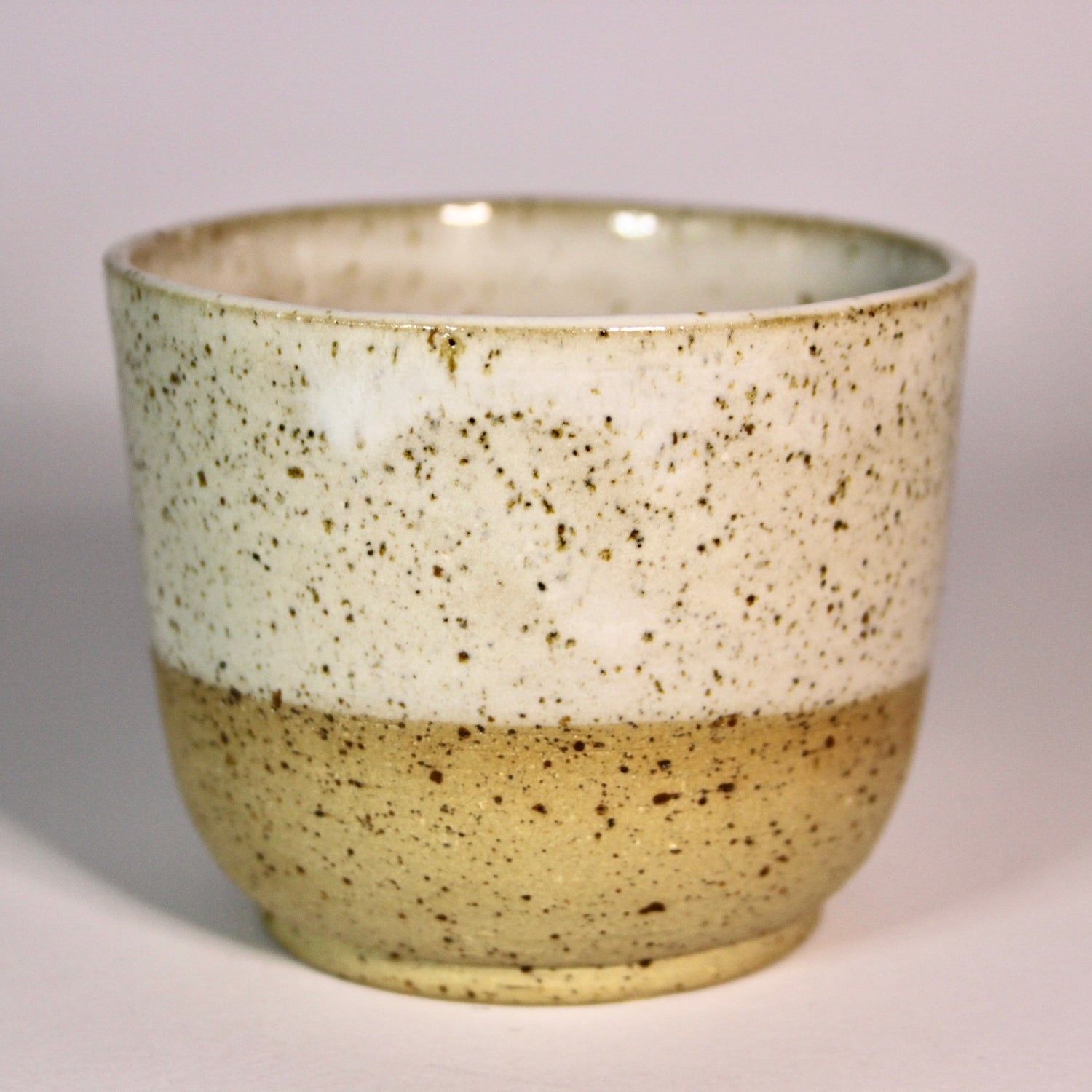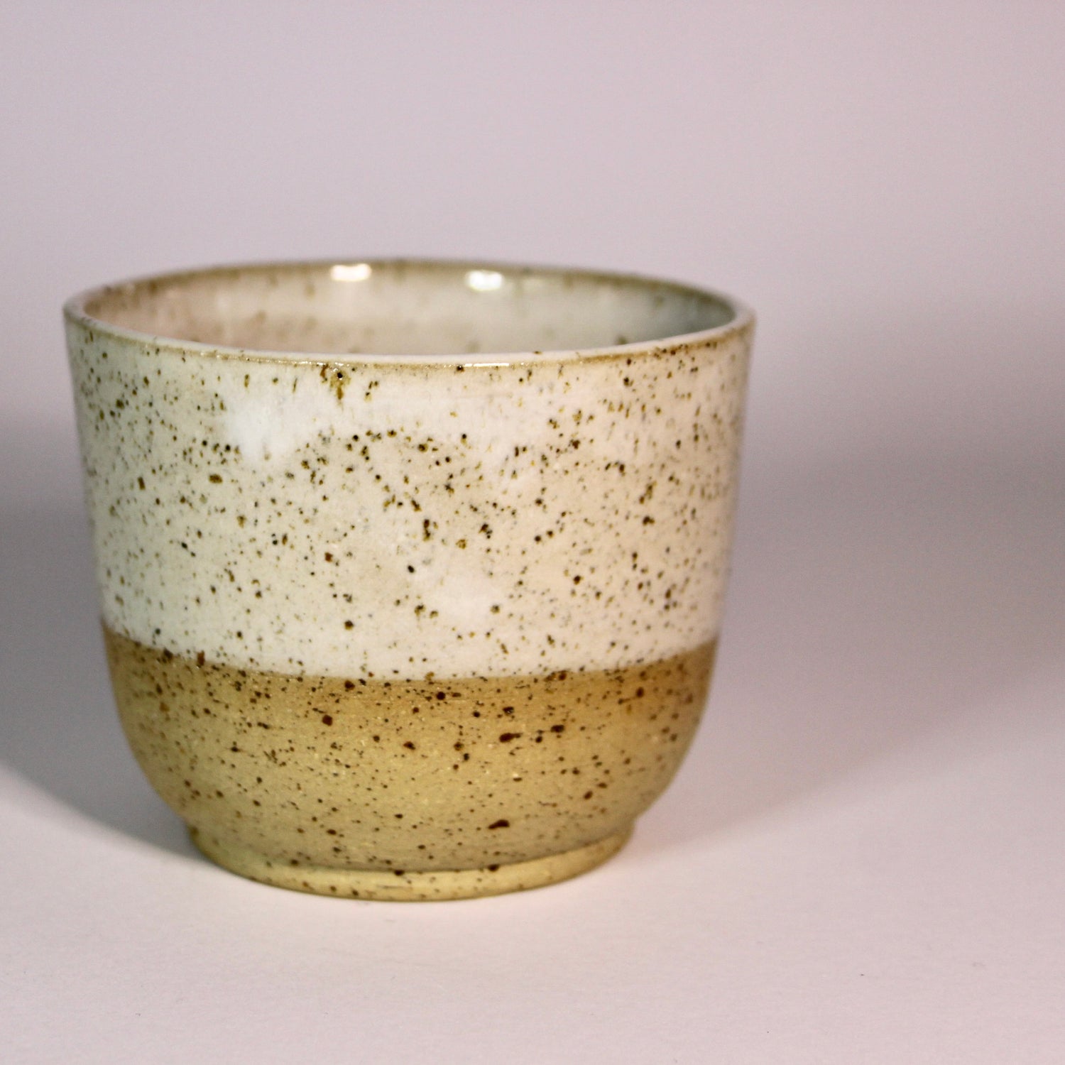 Een koffiekopje van keramiek in de kleur wit en er zit een spikkel in de klei. Handgemaakt en met een eigen glazuur toegepast.