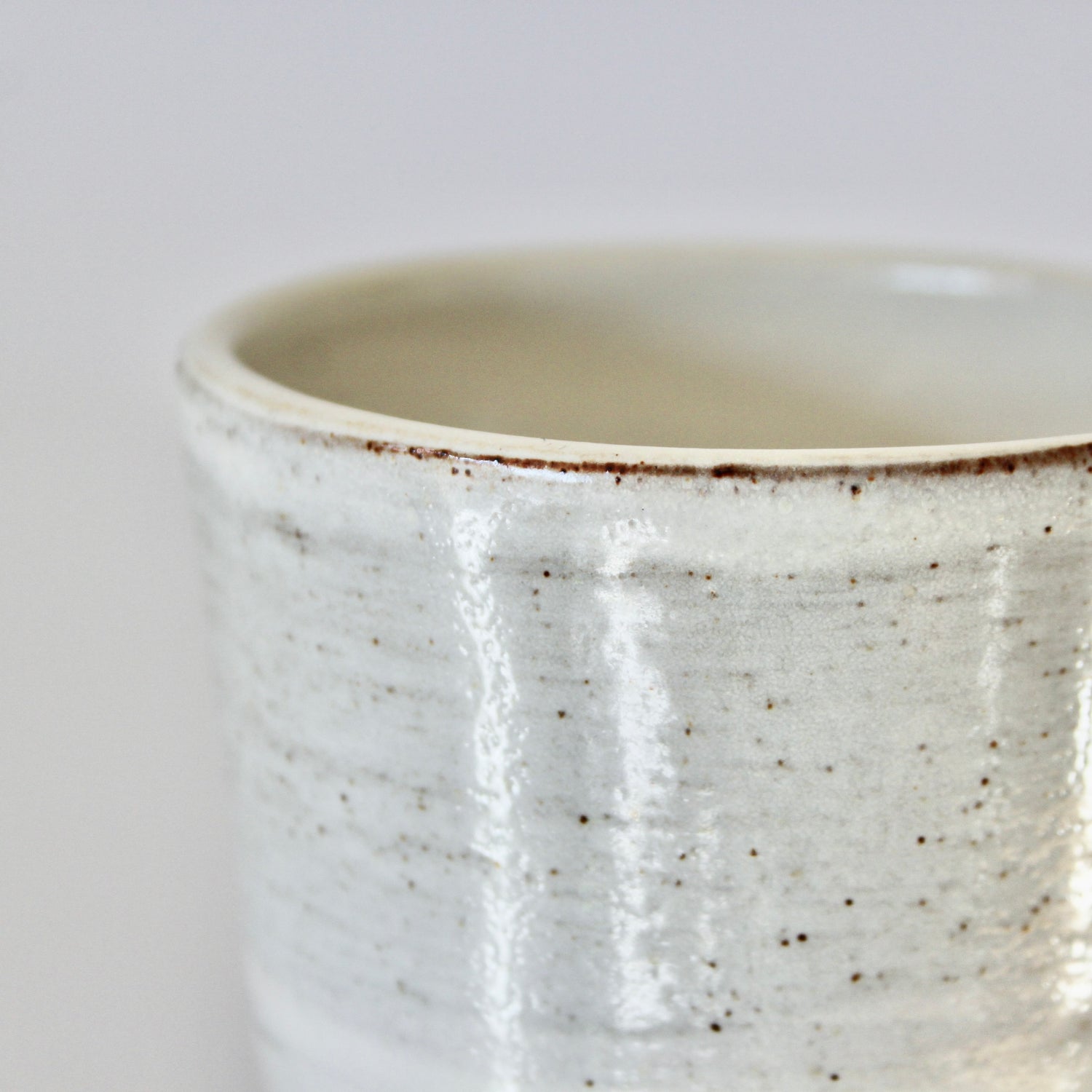 Een koffiekopje van keramiek in het wit. Handgemaakt en met een eigen glazuur toegepast.