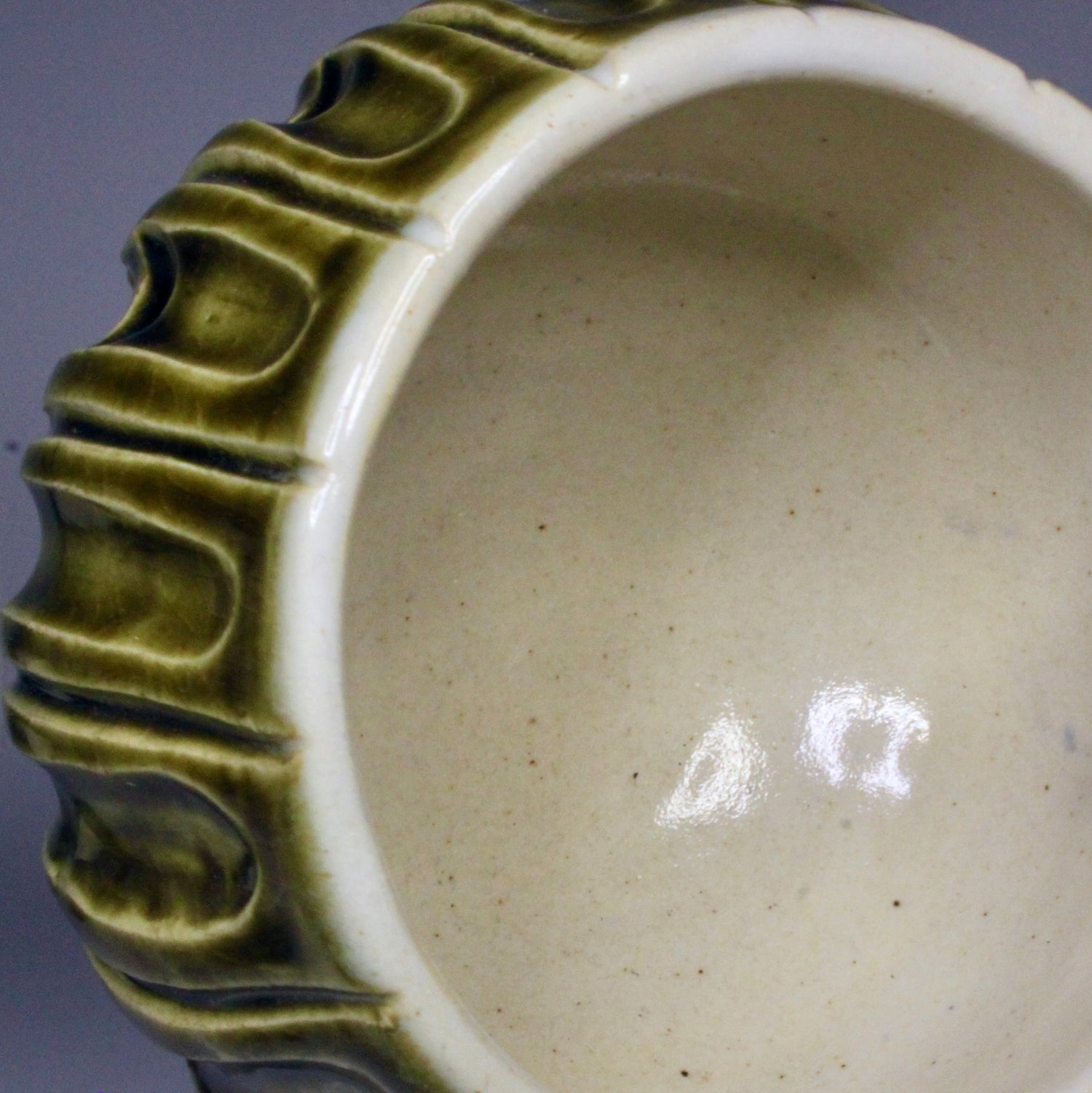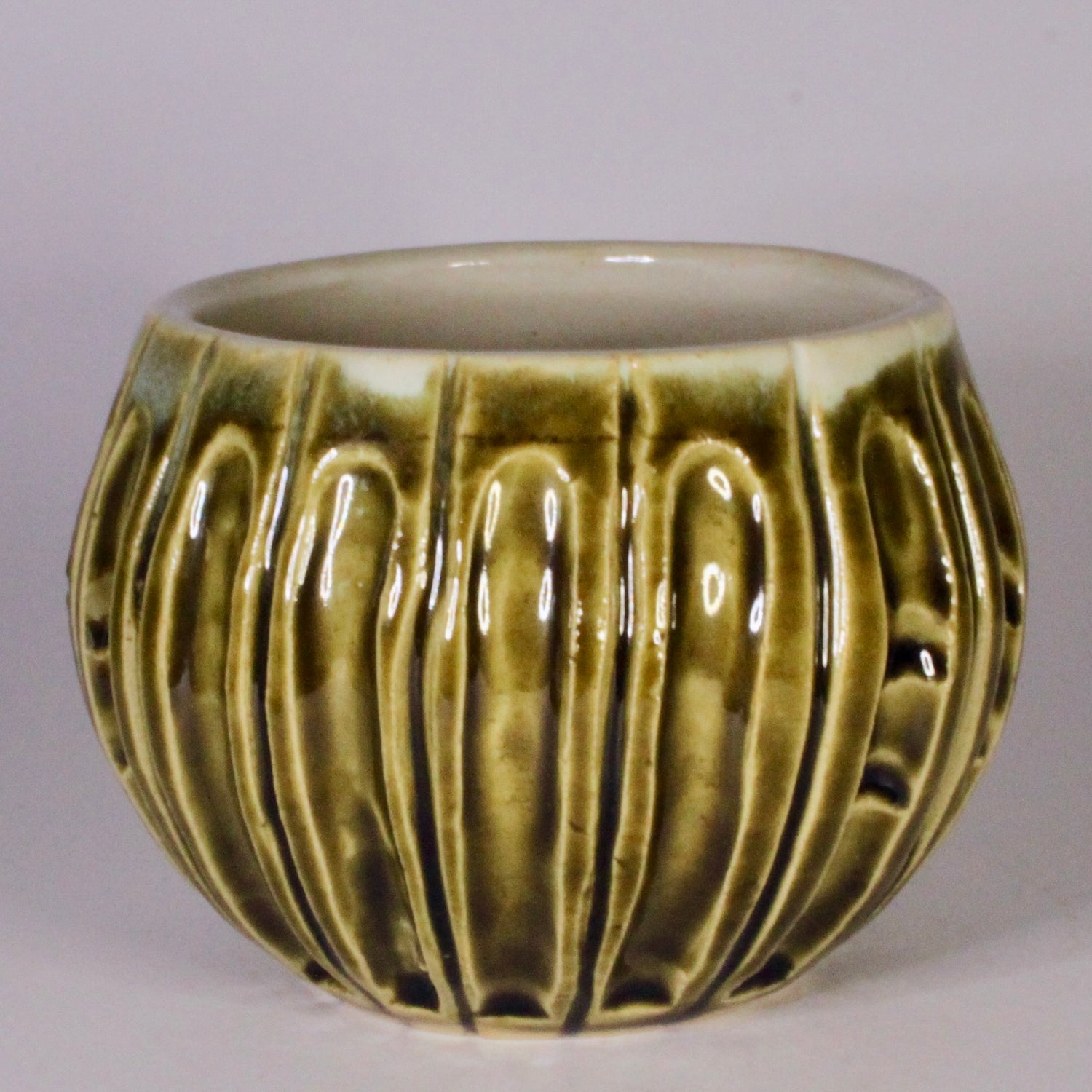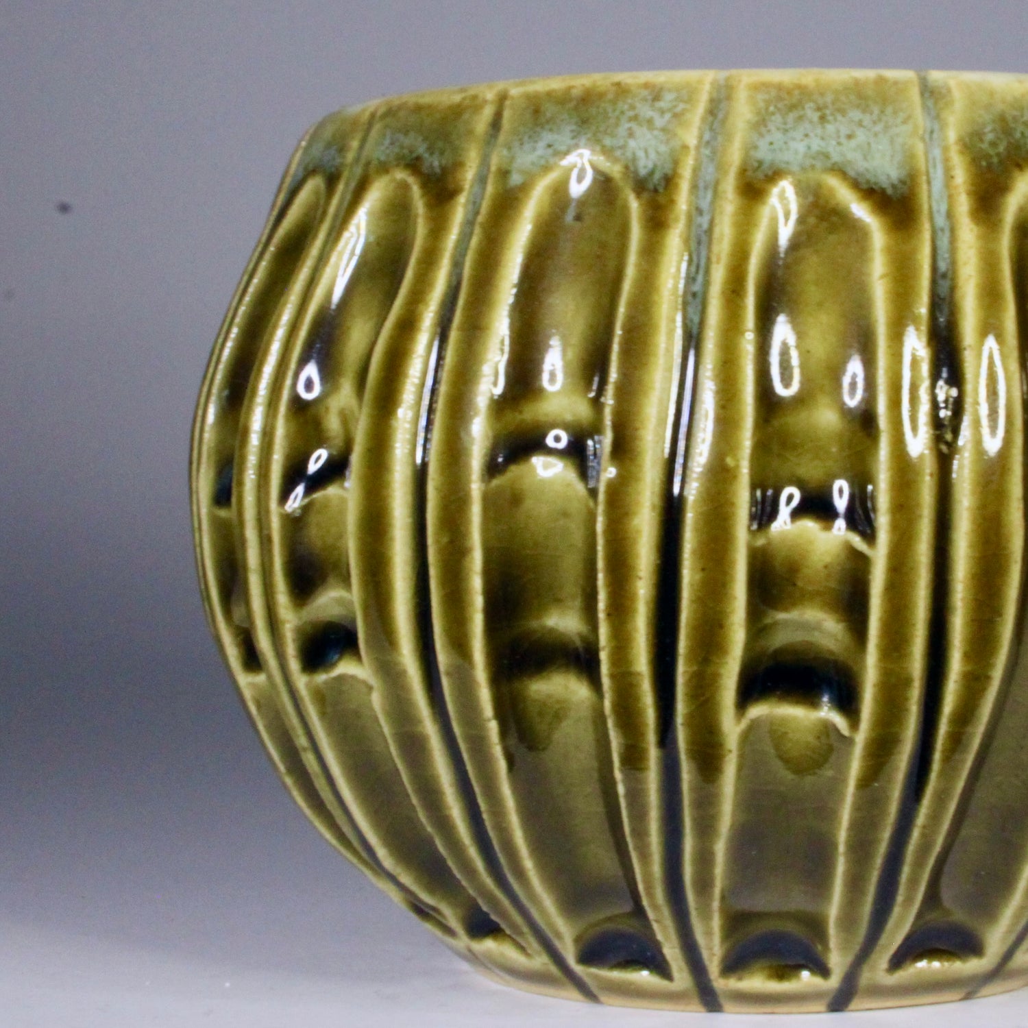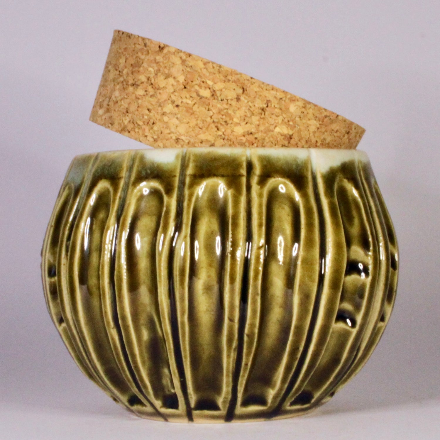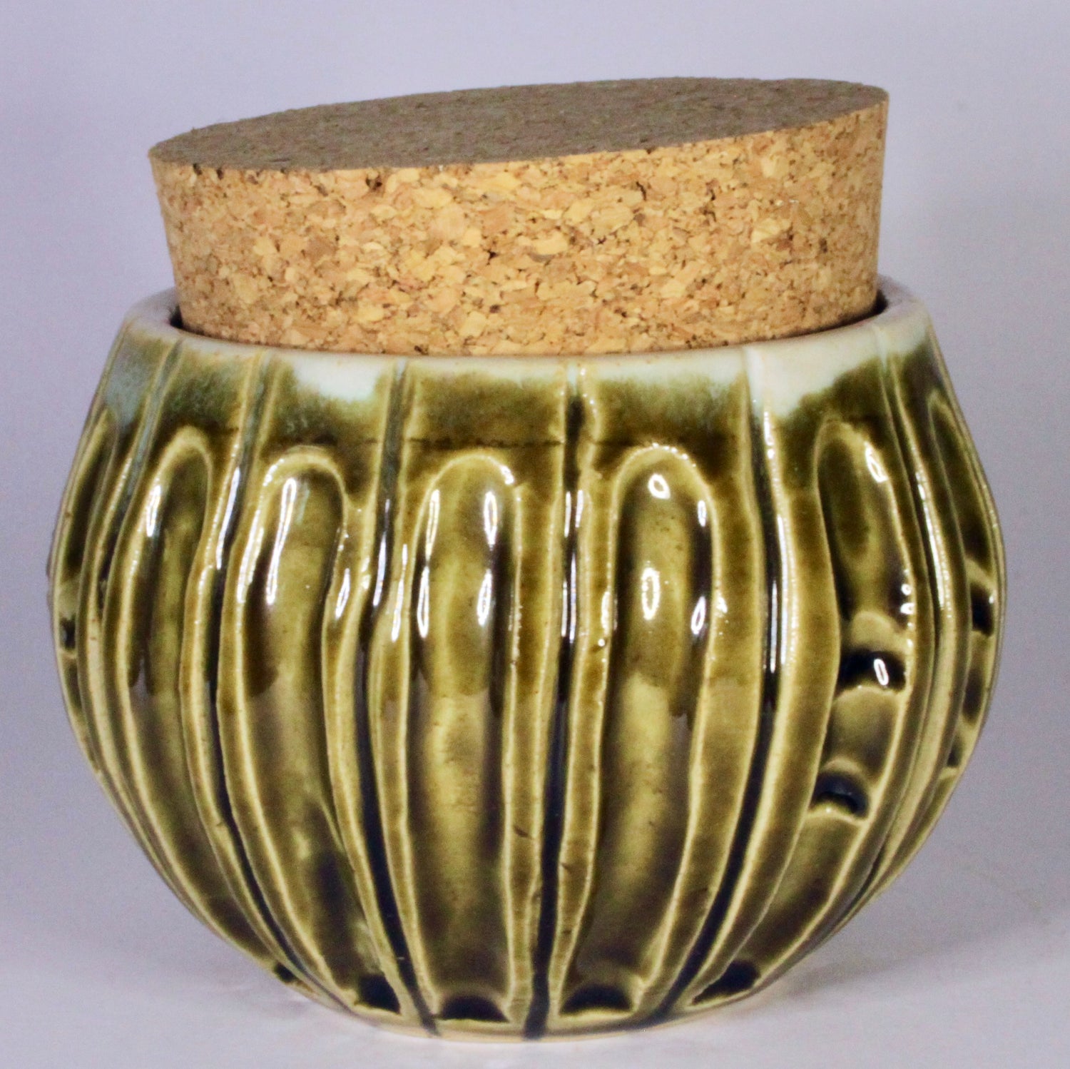 Dit is een klein formaat voorraadpotje met een kurken bondel. Het voorraadpotje is in de kleur cognac en heeft een bolle vorm met verticale uitgesneden strepen. Het is ook een gouden oude, deze is in het begin van mijn keramiek carrière gemaakt.