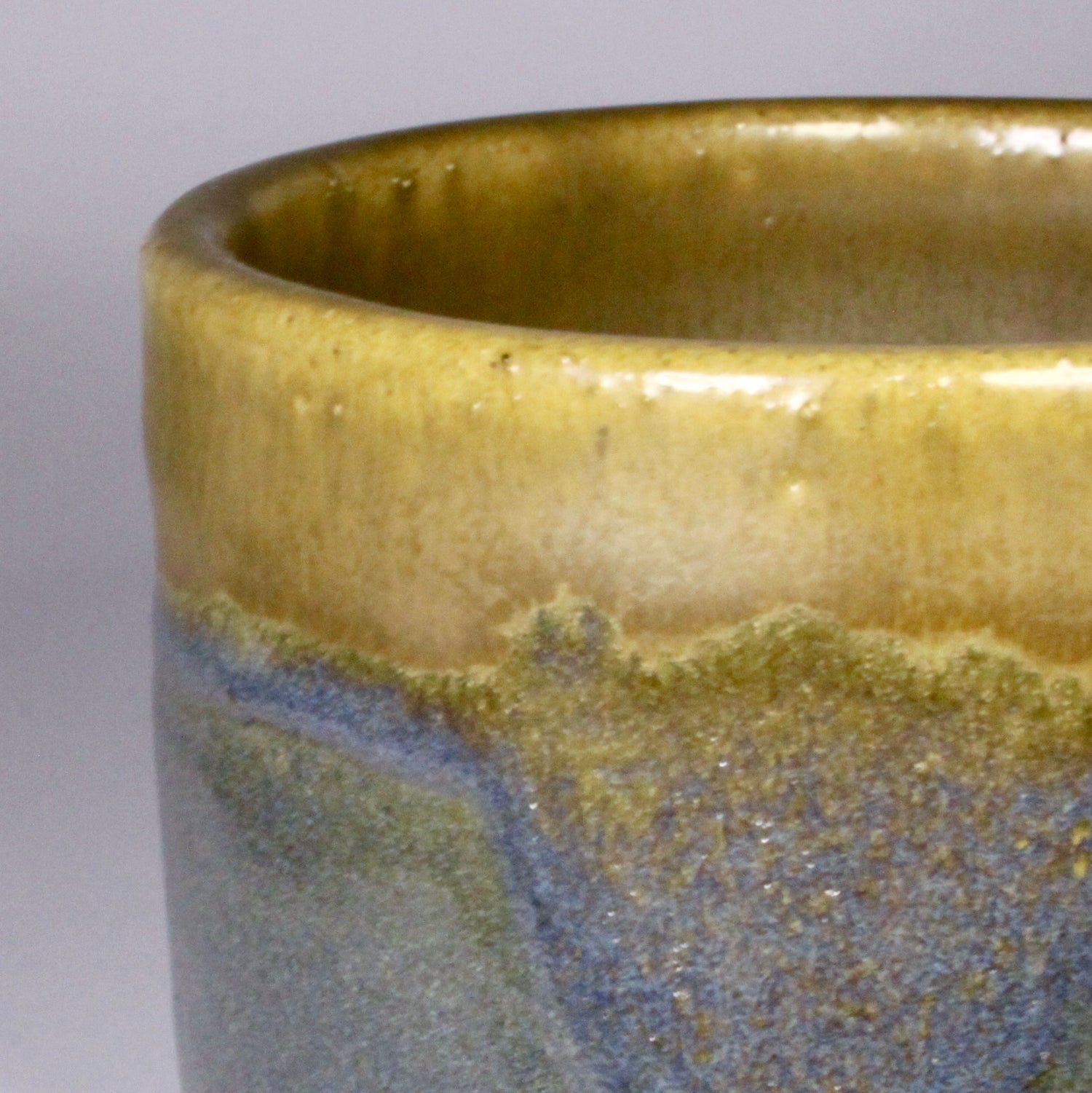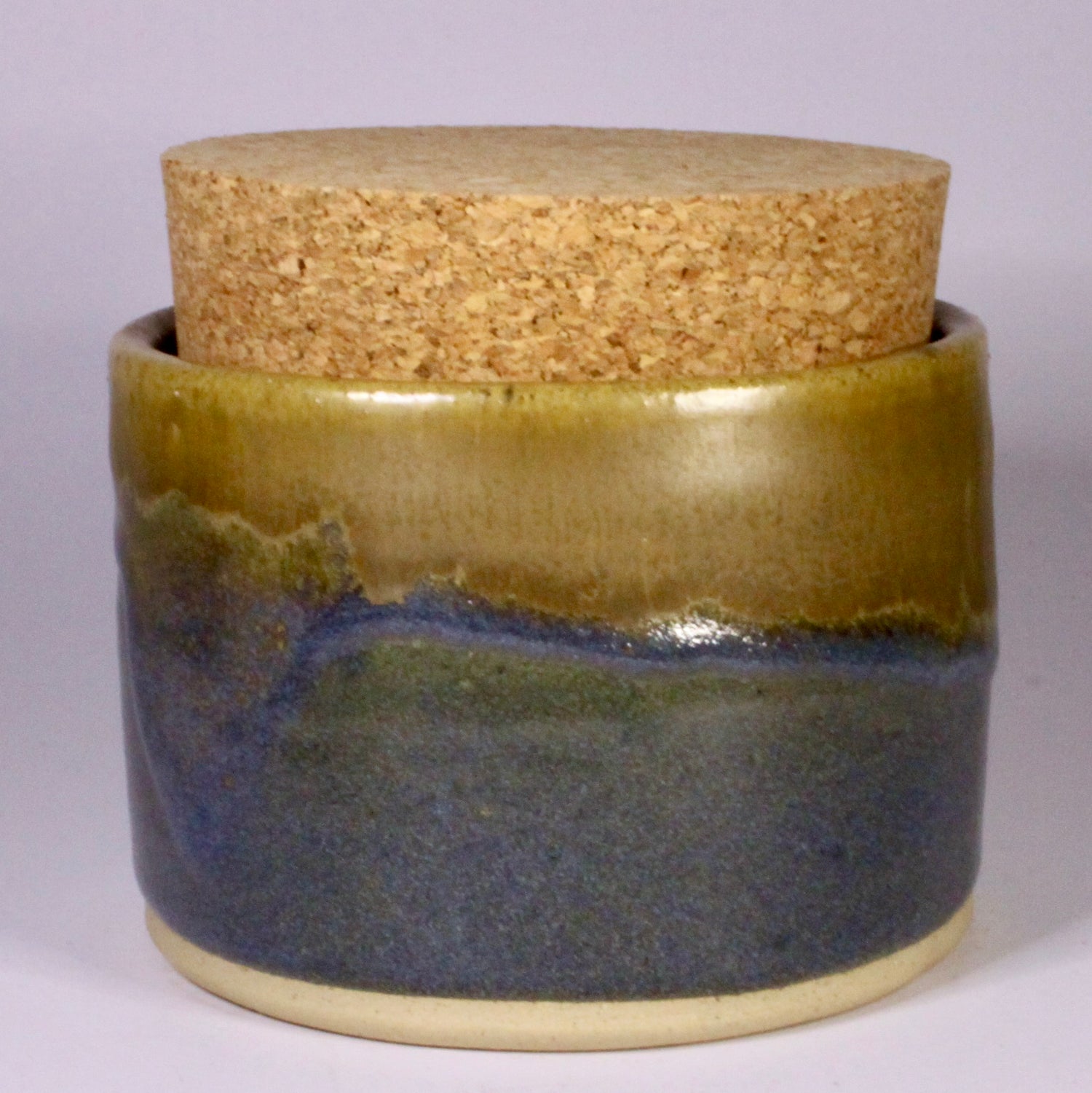 Dit is een klein formaat voorraadpotje met een kurken bondel. Het voorraadpotje is in de kleuren mat bruin en een diep blauwe kleur en heeft een rechte vorm.