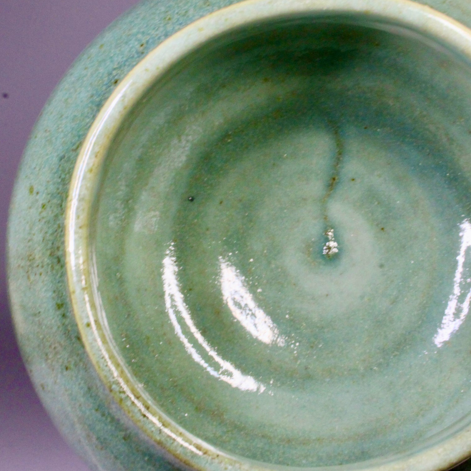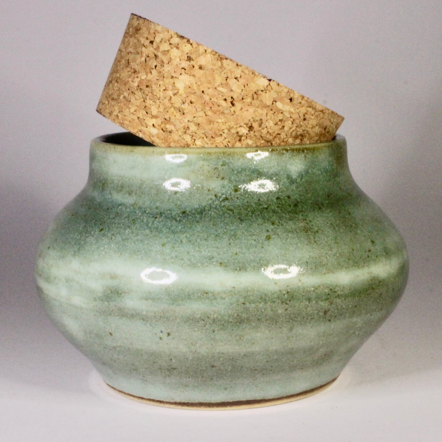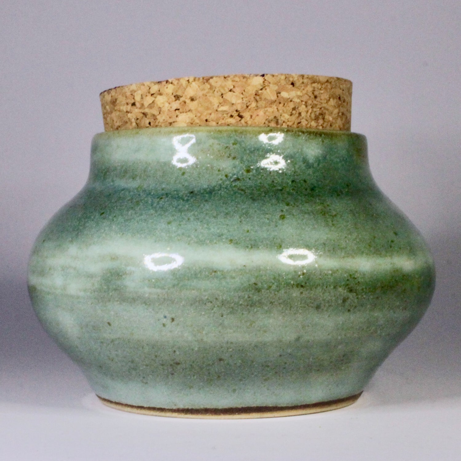 Dit is een klein formaat voorraadpotje met een kurken bondel. Het voorraadpotje is in de kleur licht groen met wit en heeft een bolle vorm met een rechte hals.