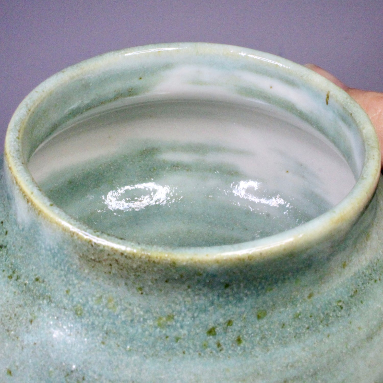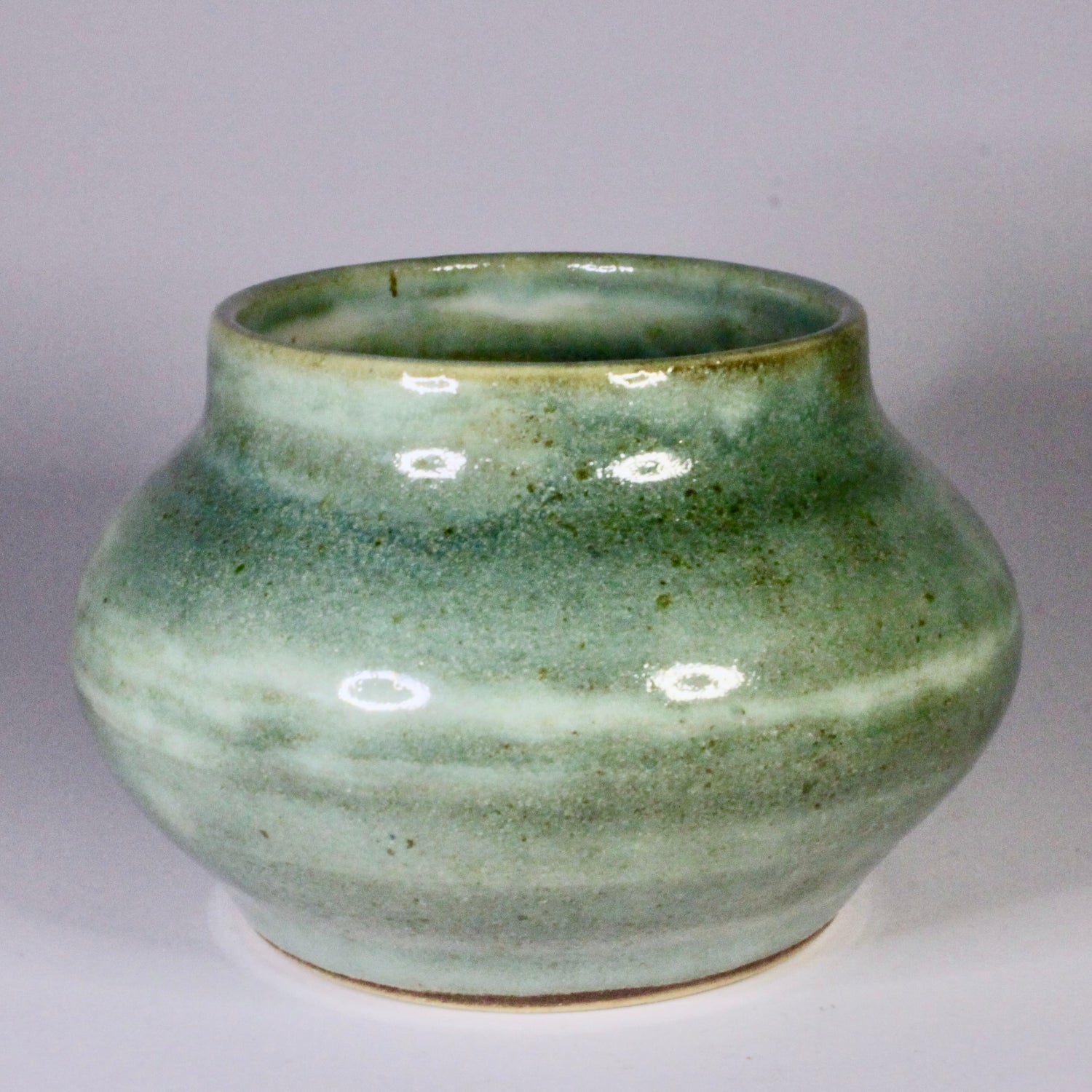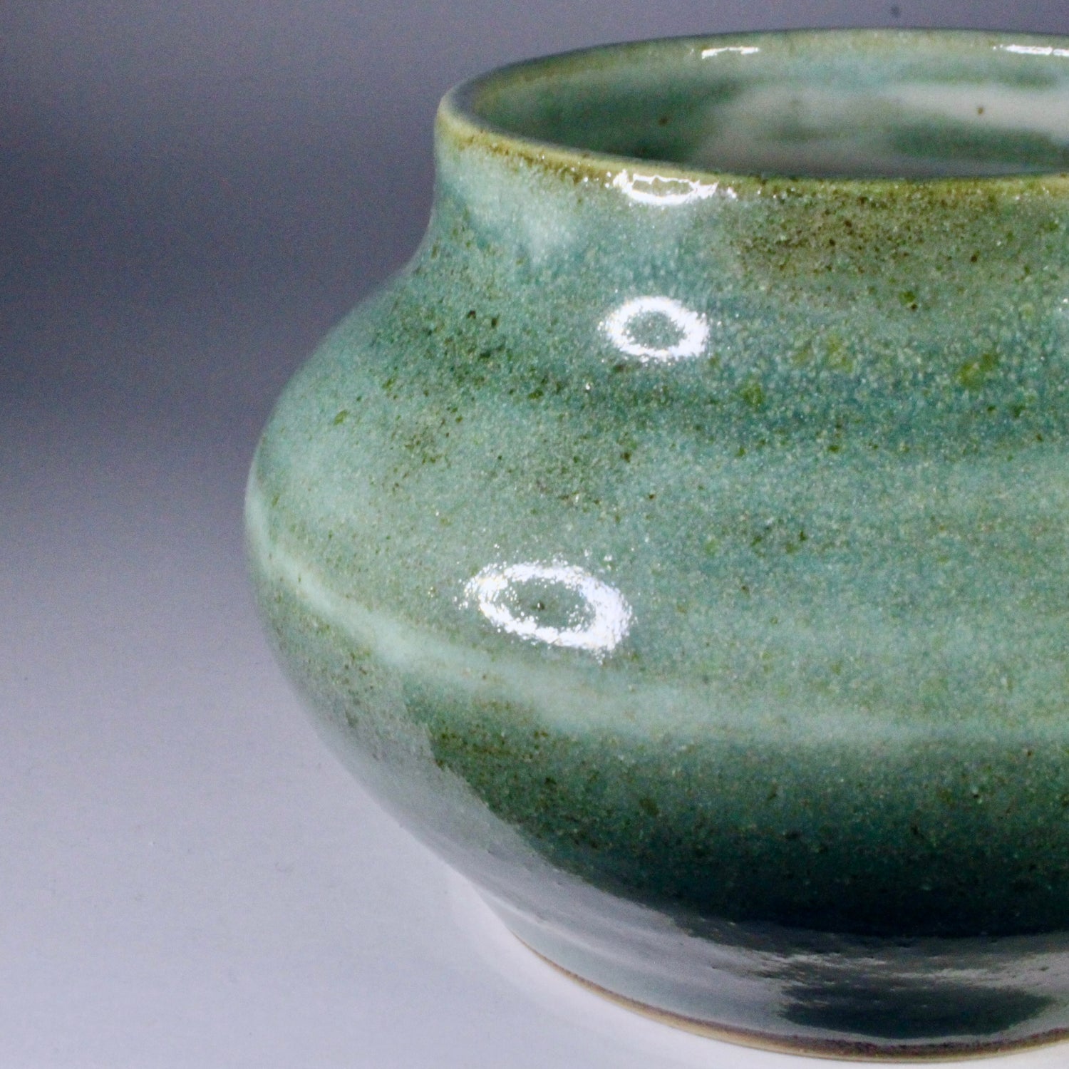 Dit is een klein formaat voorraadpotje met een kurken bondel. Het voorraadpotje is in de kleur licht groen met wit en heeft een bolle vorm met een rechte hals.