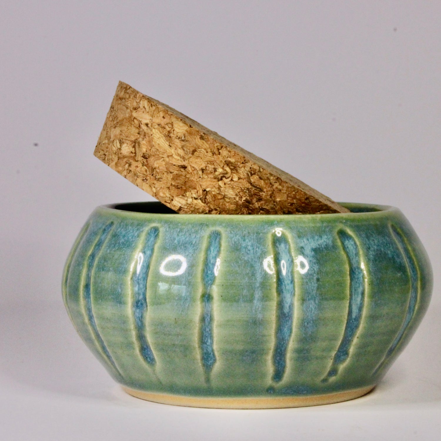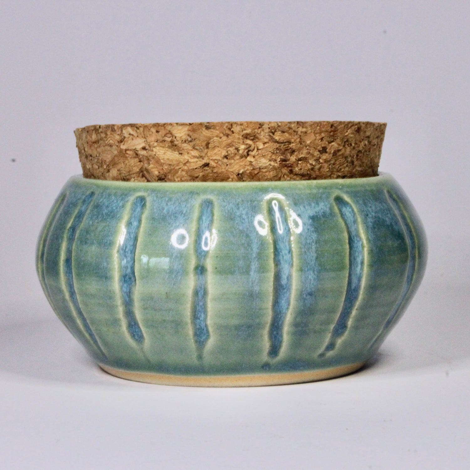 Dit is een klein formaat voorraadpotje met een kurken bondel. Het voorraadpotje is in de kleur turquoise, heeft een bolle vorm en uitgesneden verticale strepen. Hierdoor komt het glazuur nog meer tot zijn recht.