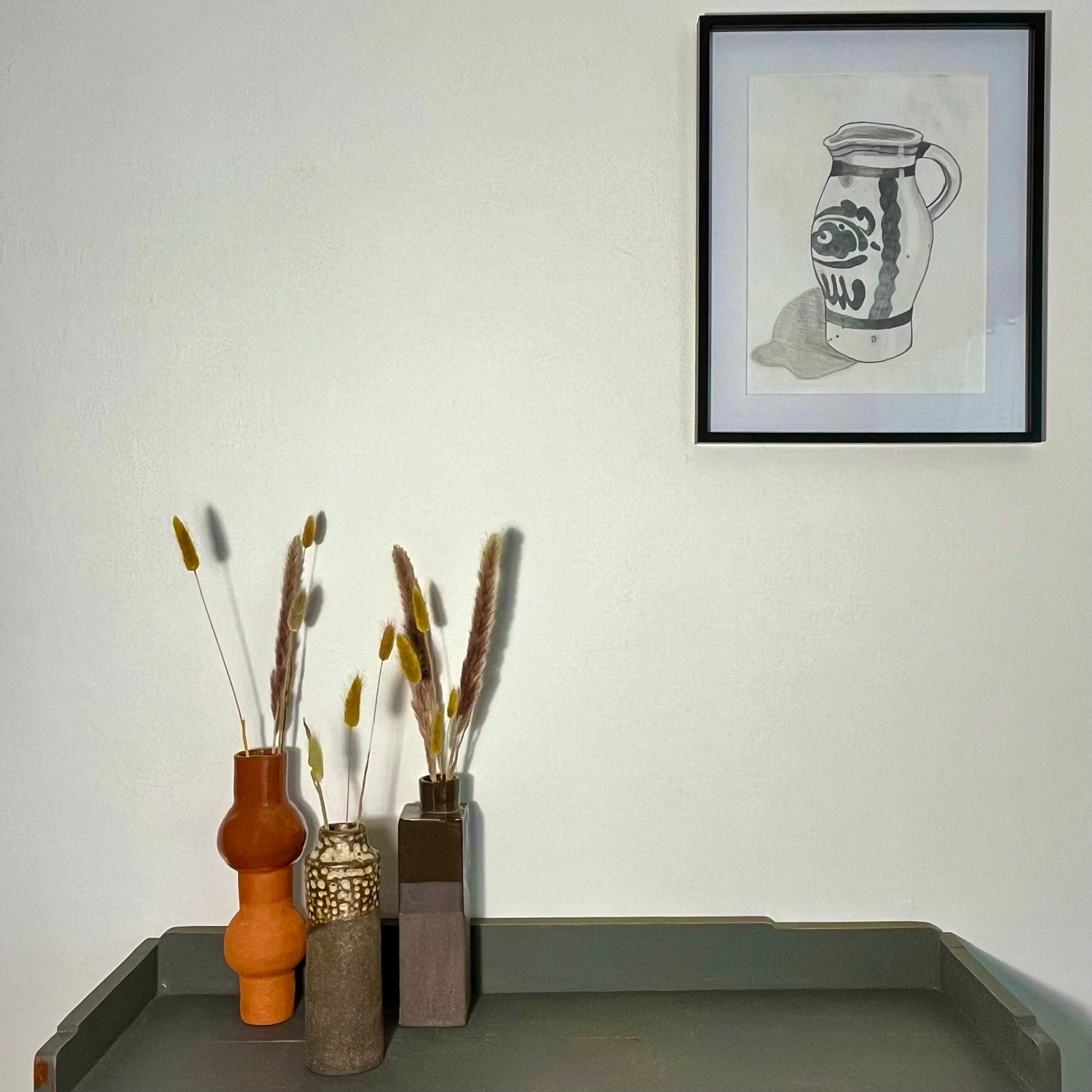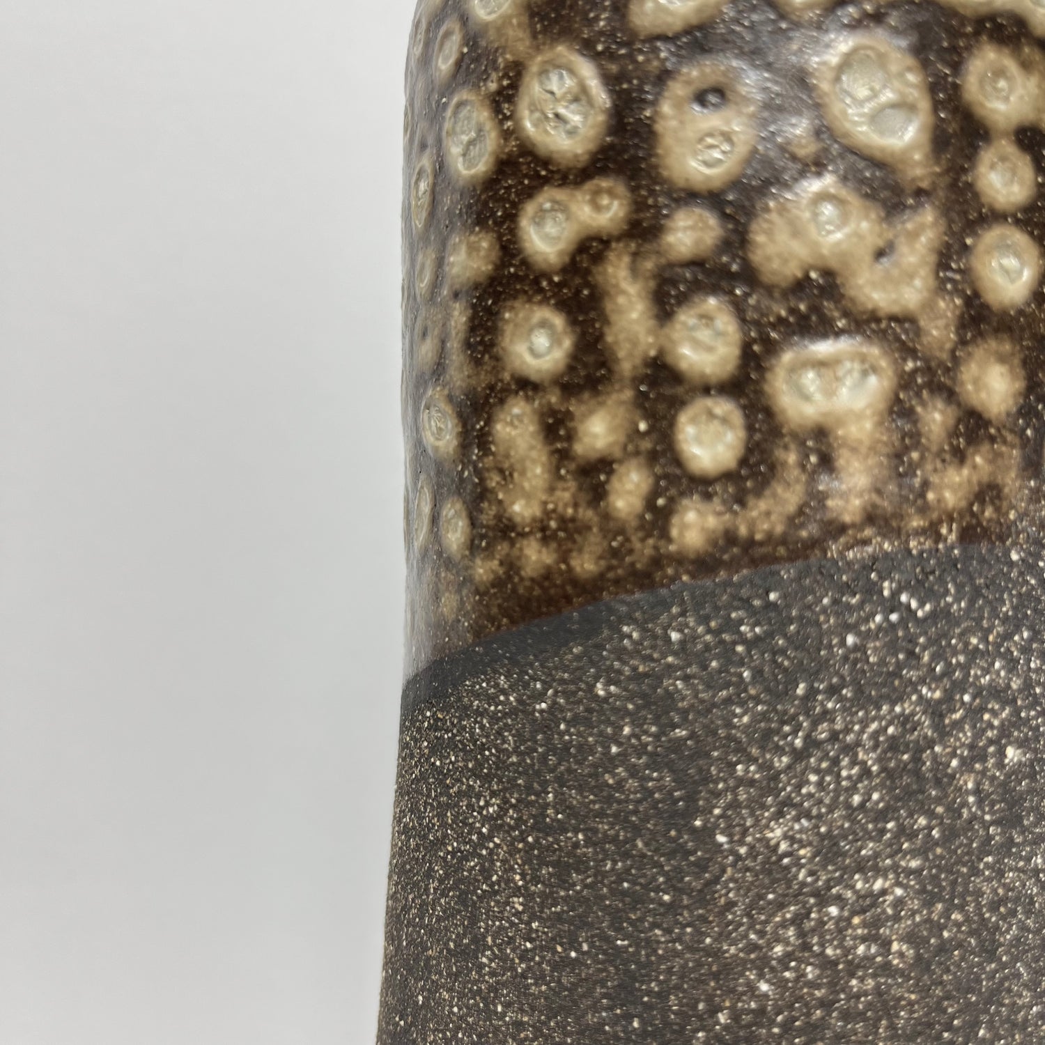 Deze handgemaakte vaas van zwarte klei is een leuke aanvulling op je interieur. De vaas is aan de binnenkant geglazuurd met transparant glazuur en aan de buitenkant met wit mat glazuur. Het glazuur aan de buitenkant heeft een rauwe uitstraling doordat het glazuur is gaan koken in het stookproces.