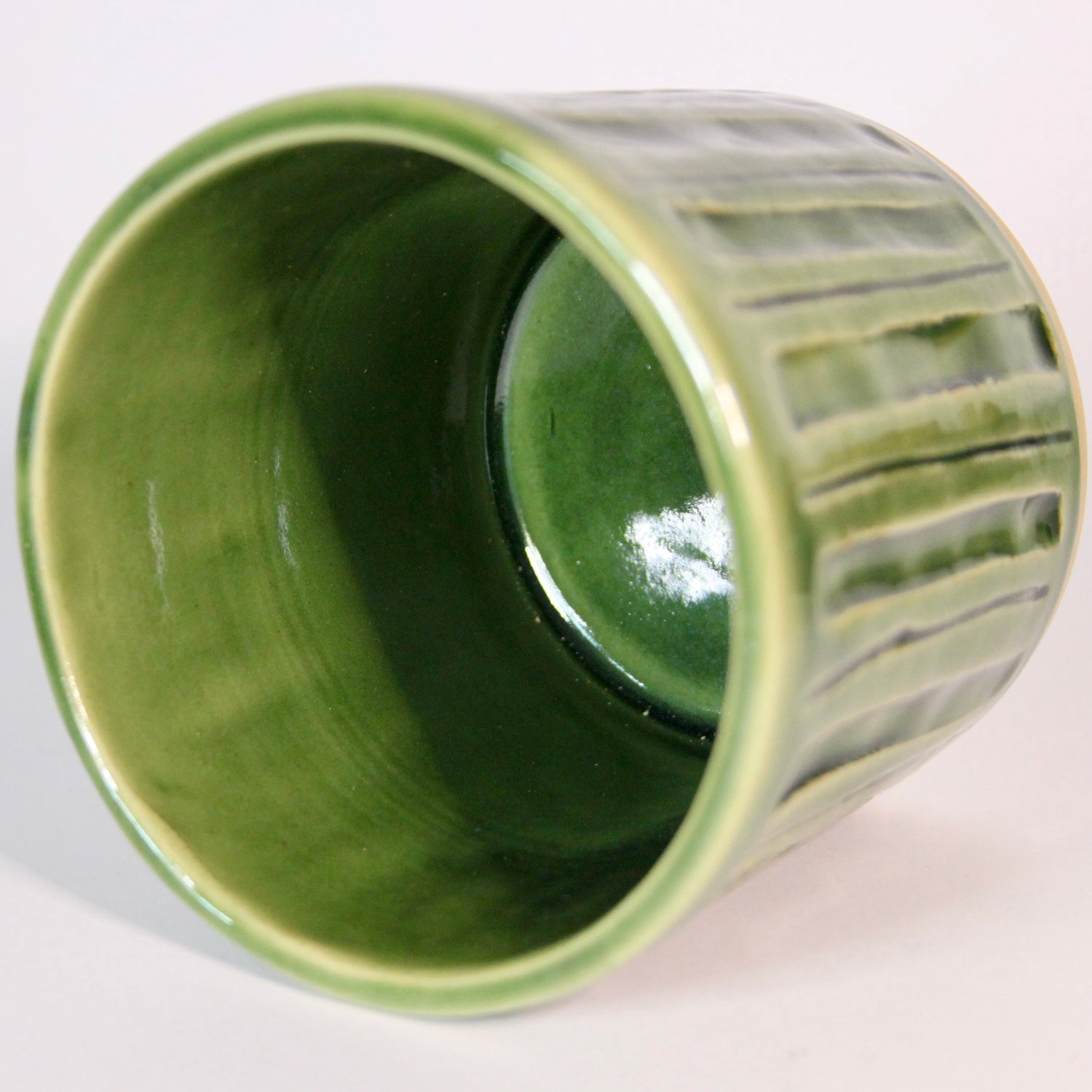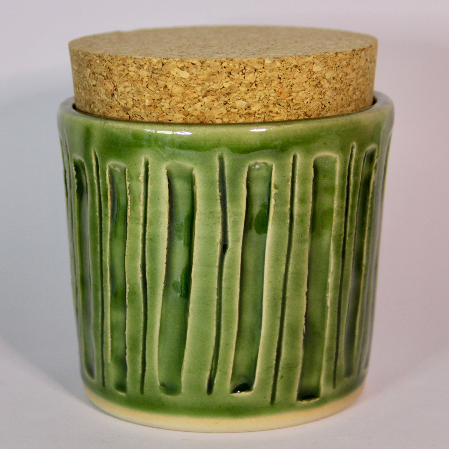Dit is een klein formaat voorraadpotje met een kurken bondel. Het voorraadpotje is in de kleur groen en heeft uitgesneden decoratie.